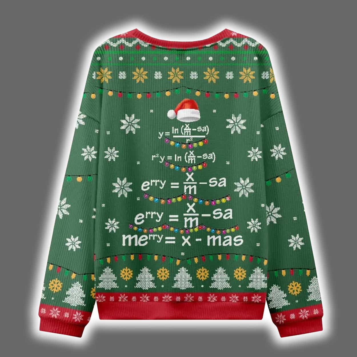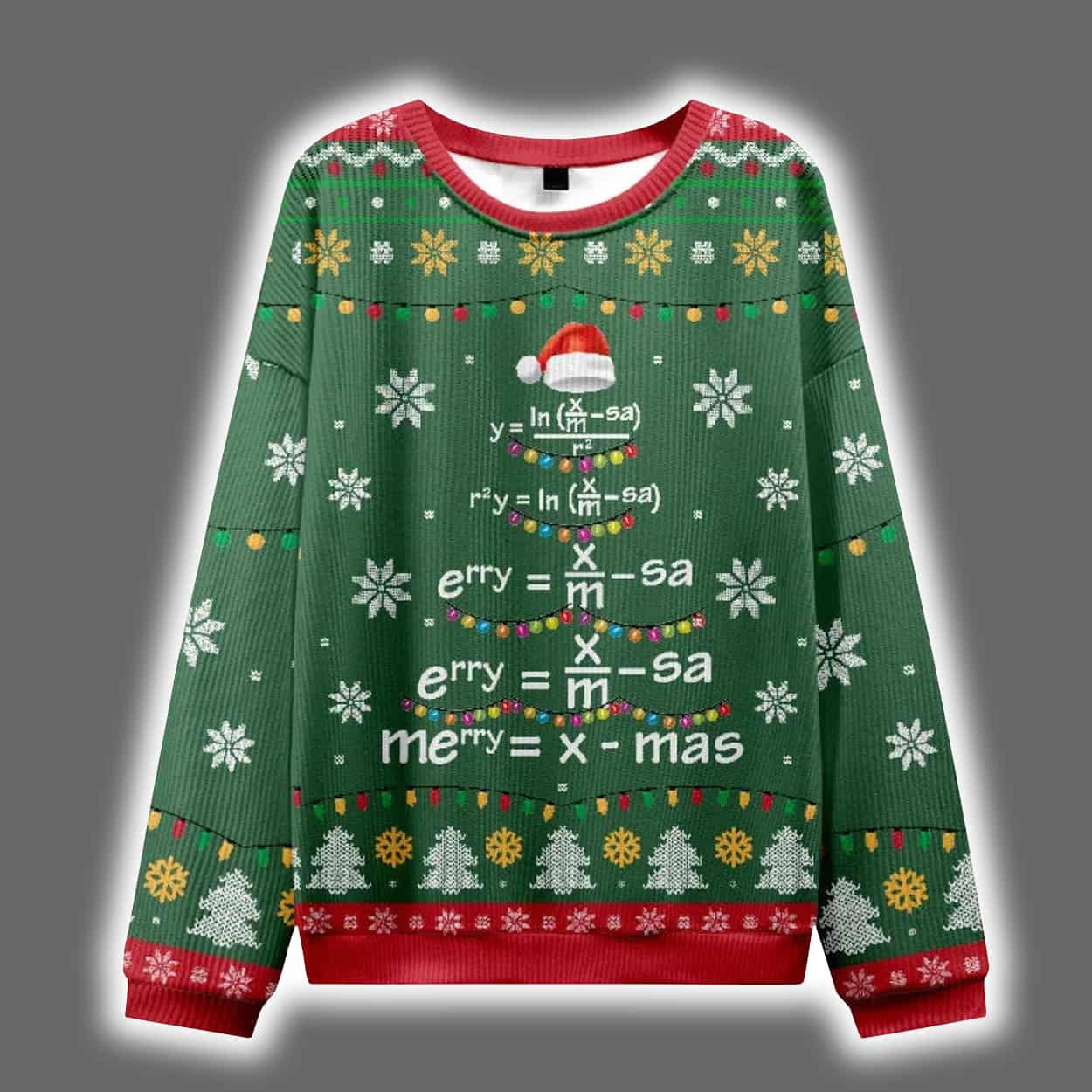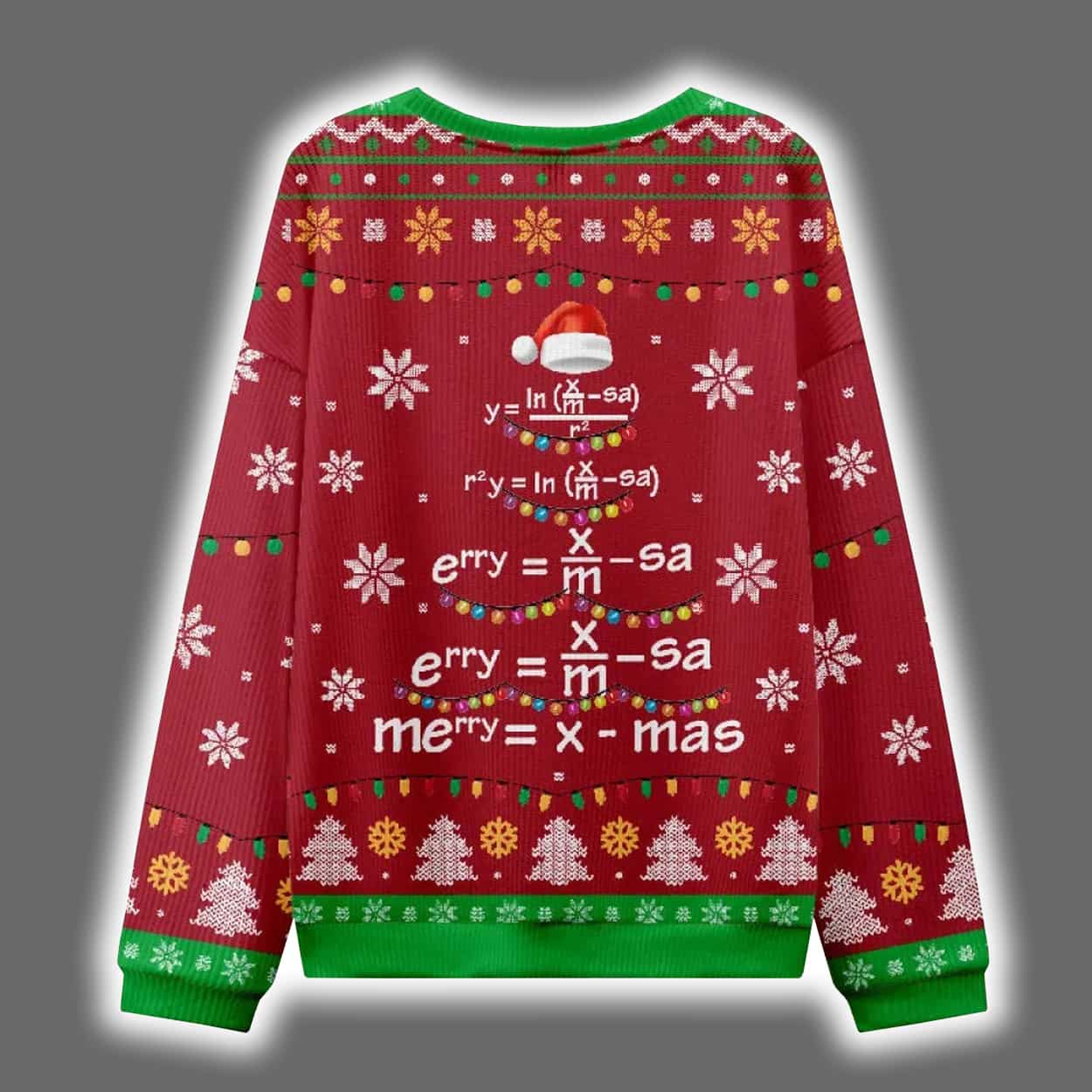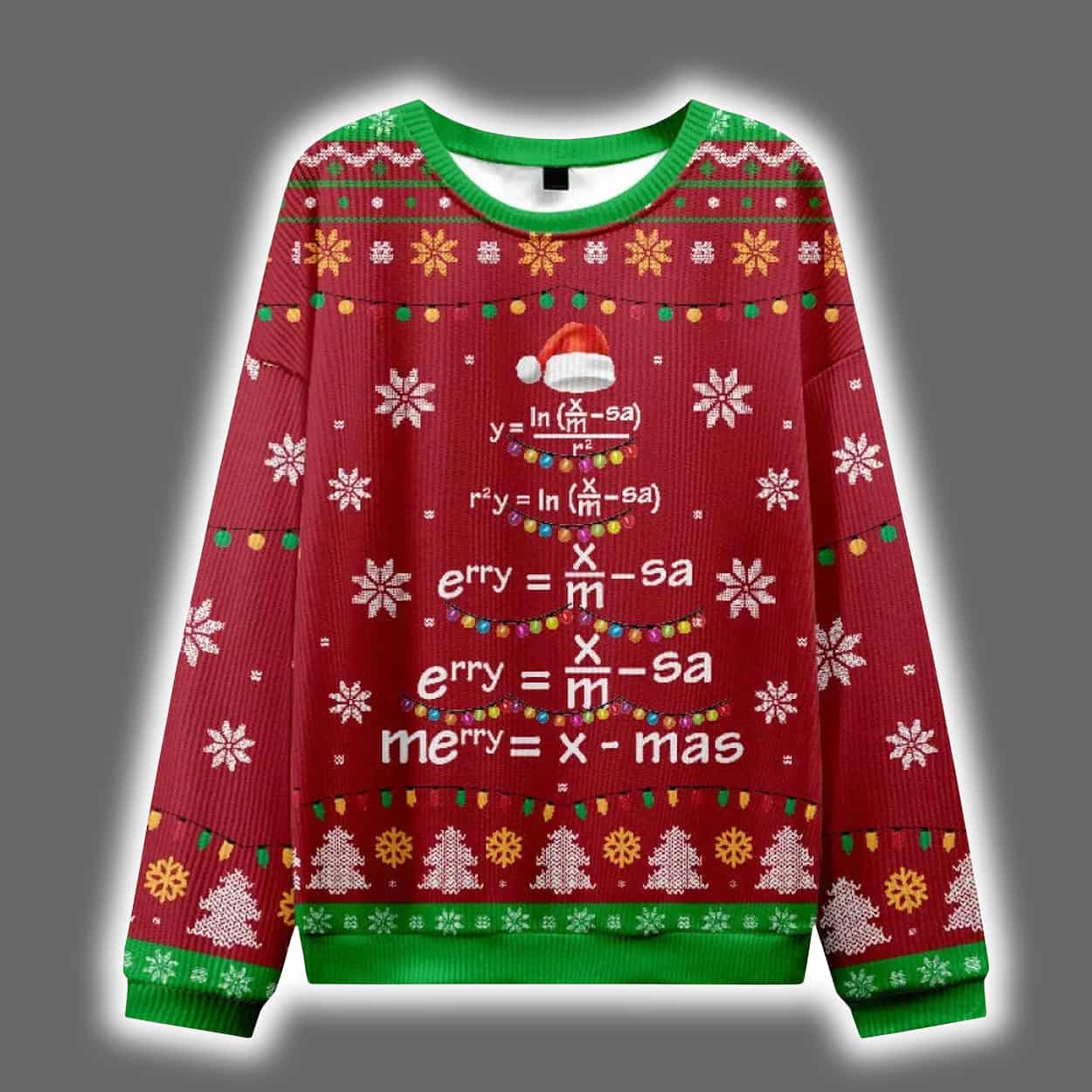 This isn’t your average ugly Christmas sweater—it’s a math lover’s dream wrapped in festive flair! This sweater features a bold red base with green accents and classic holiday motifs like snowflakes, Christmas trees, and reindeer. But the real showstopper? A series of hilariously nerdy equations that cleverly decode the word “Christmas” using mathematical notation. From integrals and logarithms to playful variables, the sweater spells out “merry = x – mas” with academic charm and seasonal sass. It’s the perfect blend of cozy and calculated.