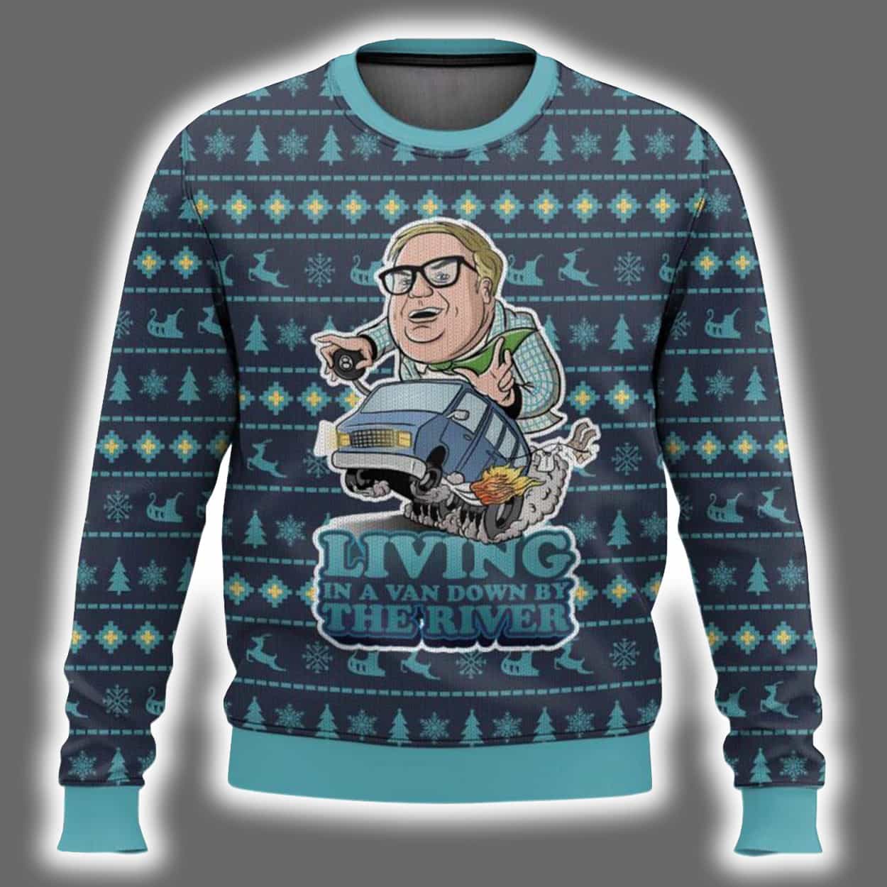 Ready to motivate the room with unmatched energy and holiday absurdity? Throw on the Matt Foley Living In A Van Down By The River Saturday Night Live Ugly Christmas Sweater and let your festive freak flag fly. Because nothing says Christmas like yelling about vans and rivers in front of the fireplace.