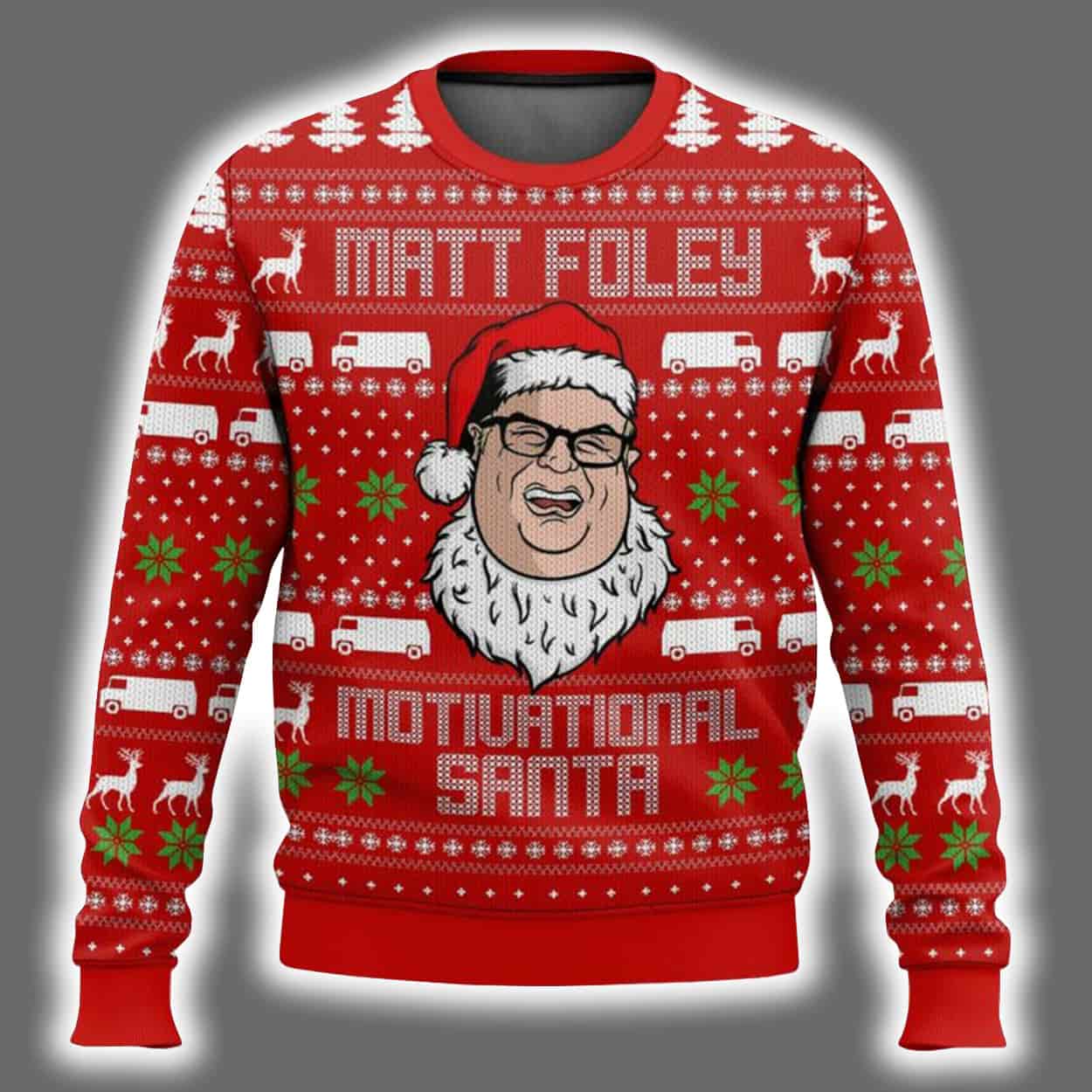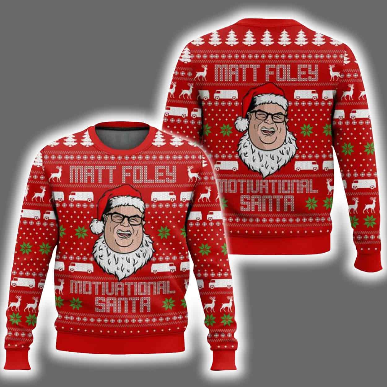 Get ready to jingle all the way with this sweater—a tribute to one of comedy’s most unforgettable characters. The front and back showcase a cheerful cartoon of Matt Foley, complete with his signature glasses and a Santa hat, grinning like he’s about to deliver a motivational speech that’ll shake the chimney. Above the image, “MATT FOLEY” is boldly printed, while below, the phrase “MOTIVATIONAL SANTA” seals the deal. Surrounding the illustration are classic holiday patterns—snowflakes, reindeer, Christmas trees, and gift boxes—all woven into a vibrant red backdrop that screams festive fun.