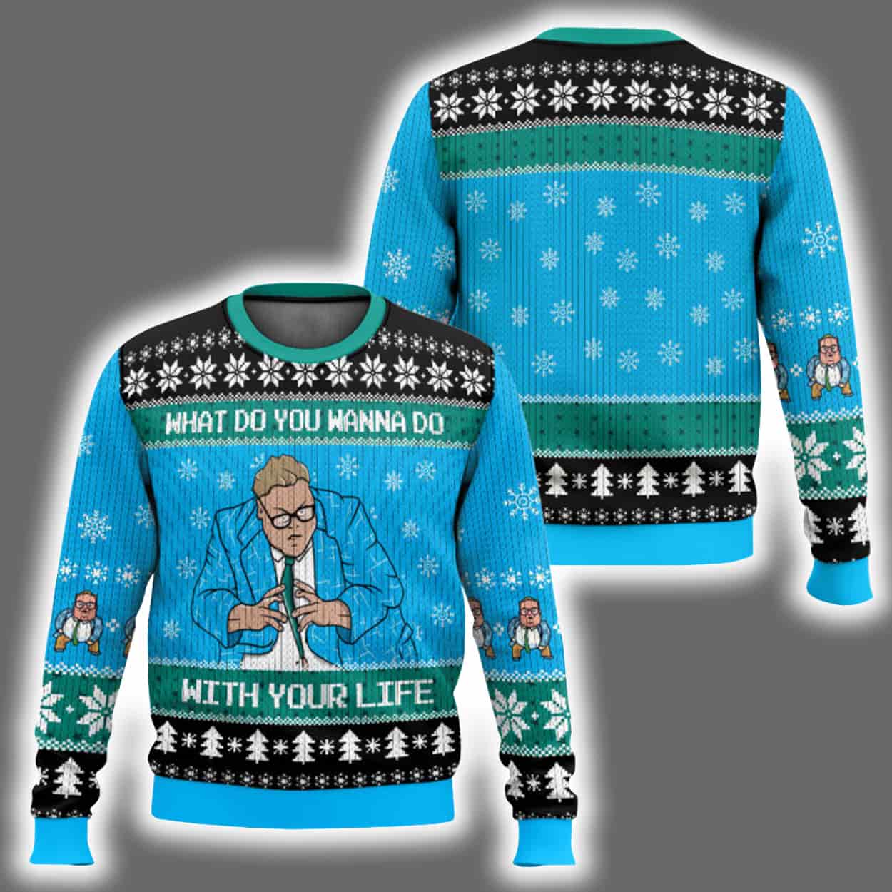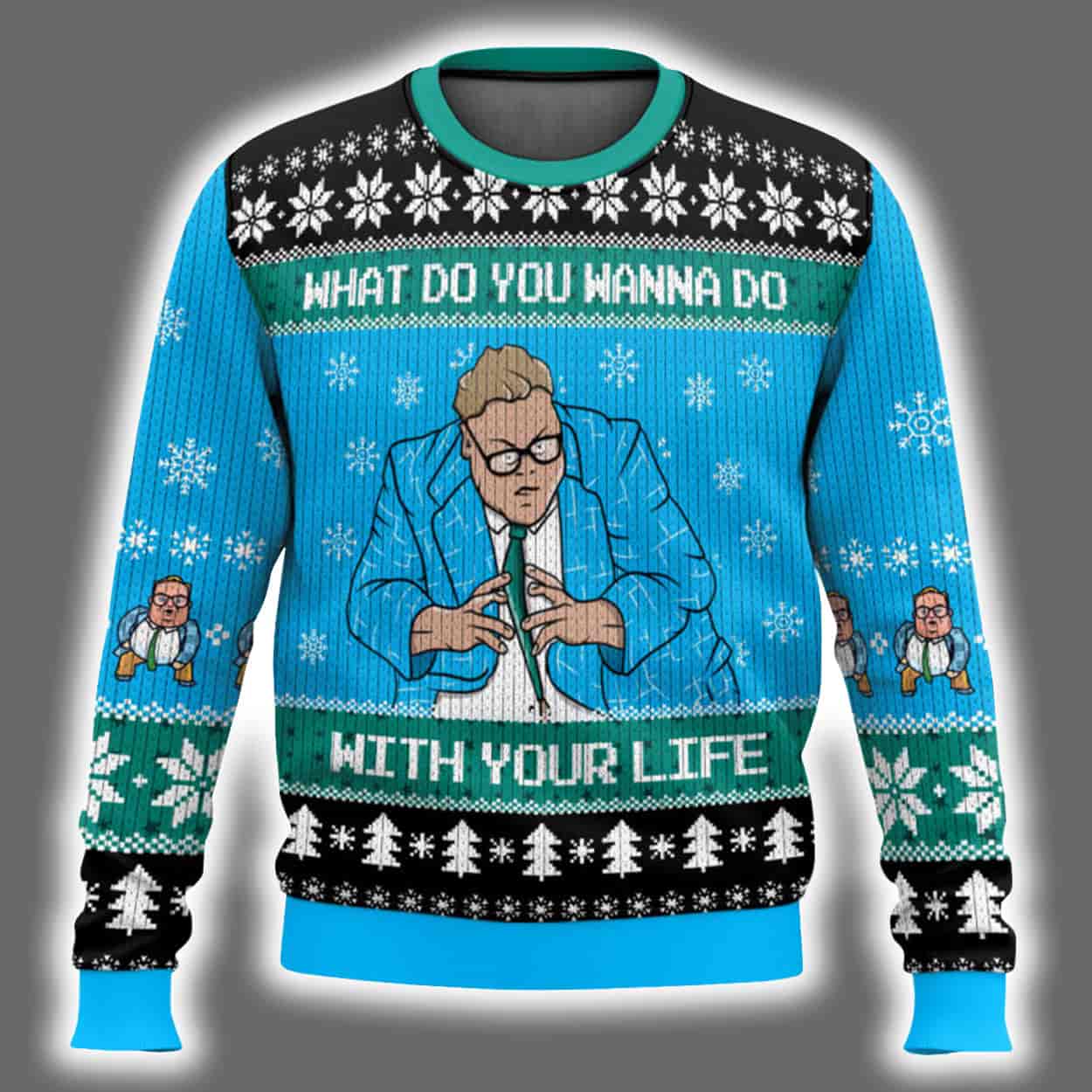 Bring the energy of one of SNL’s most iconic sketches to your holiday wardrobe with this sweater. Featuring a cartoon-style illustration of Matt Foley—complete with his blue suit, glasses, and signature finger-pointing pose—this sweater captures the unforgettable moment when he demands, “WHAT DO YOU WANNA DO WITH YOUR LIFE?” The bold text frames the image perfectly, turning a classic comedy line into a festive mantra. Surrounding the central design are cheerful snowflakes, Christmas trees, and quirky cartoon characters that wrap around the sleeves and back, making this sweater a full-on celebration of holiday humor.