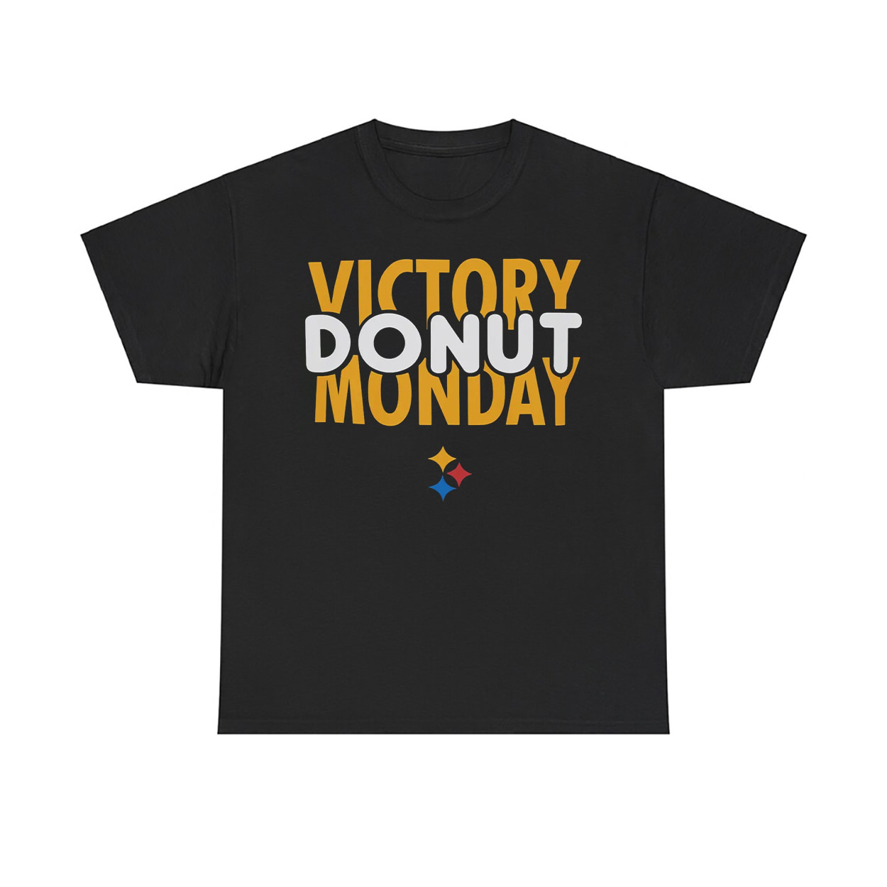 This shirt is more than just fan gear — it’s a wearable celebration of Pittsburgh’s most delicious ritual. With the phrase “Victory Donut Monday” stacked in bold block letters, this shirt captures the energy of a Steelers win and the sugary joy that follows. “DONUT” gleams in soft white, reminiscent of fresh frosting, while “VICTORY” and “MONDAY” shine in the unmistakable gold and black that screams Steel City pride. Anchoring the design is a trio of diamond shapes — a playful nod to the Steelmark symbol — adding just the right touch of iconic flair.