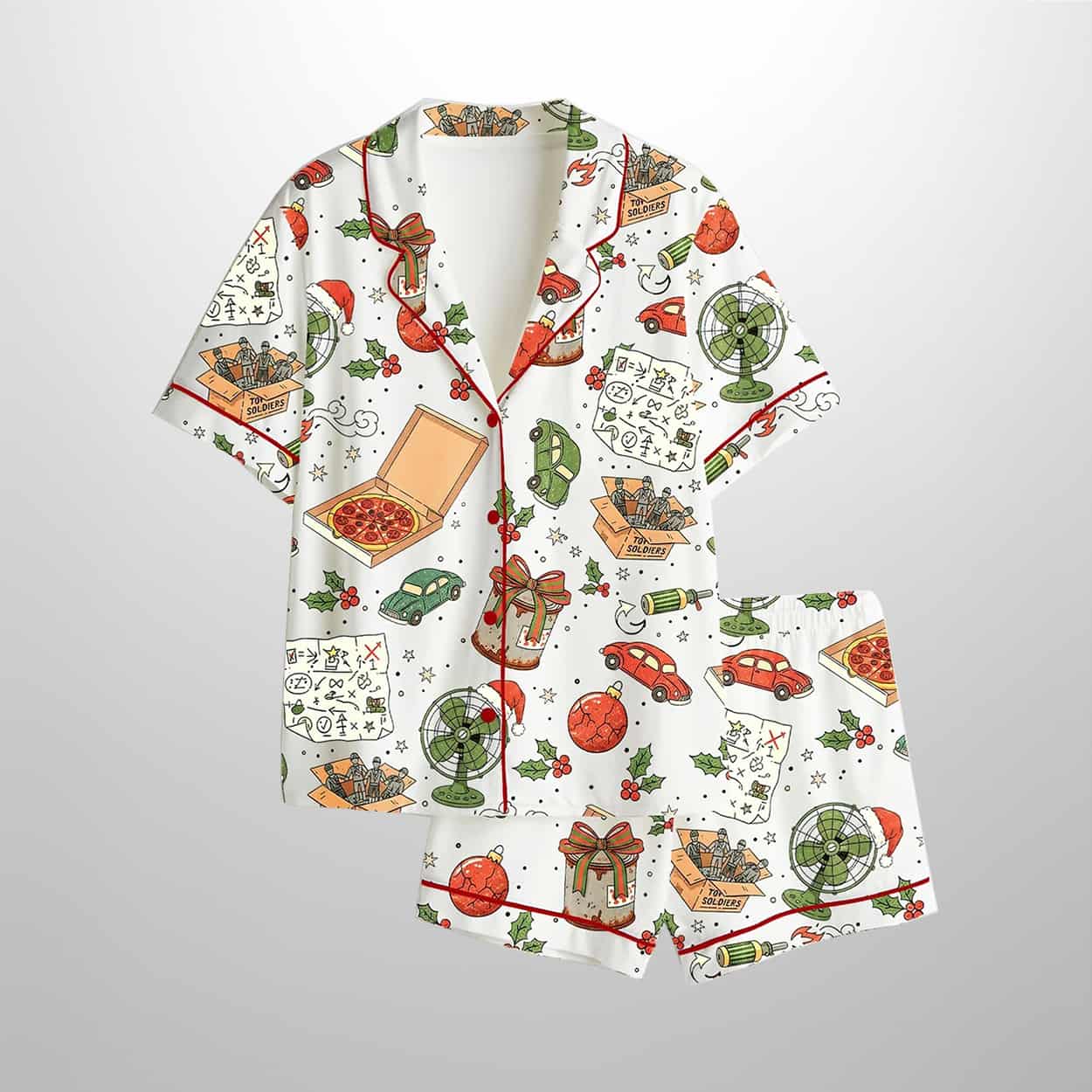 Get ready to defend your holiday spirit in style with this pajama set. This short-sleeved button-up top and matching shorts feature a delightfully chaotic print of pizza boxes, globes, red mushrooms, treasure maps, leafy plants, and chests—each element playfully nodding to adventure, mischief, and holiday mayhem. Red piping adds a bold outline to the whimsical design, making this set as eye-catching as it is cozy.