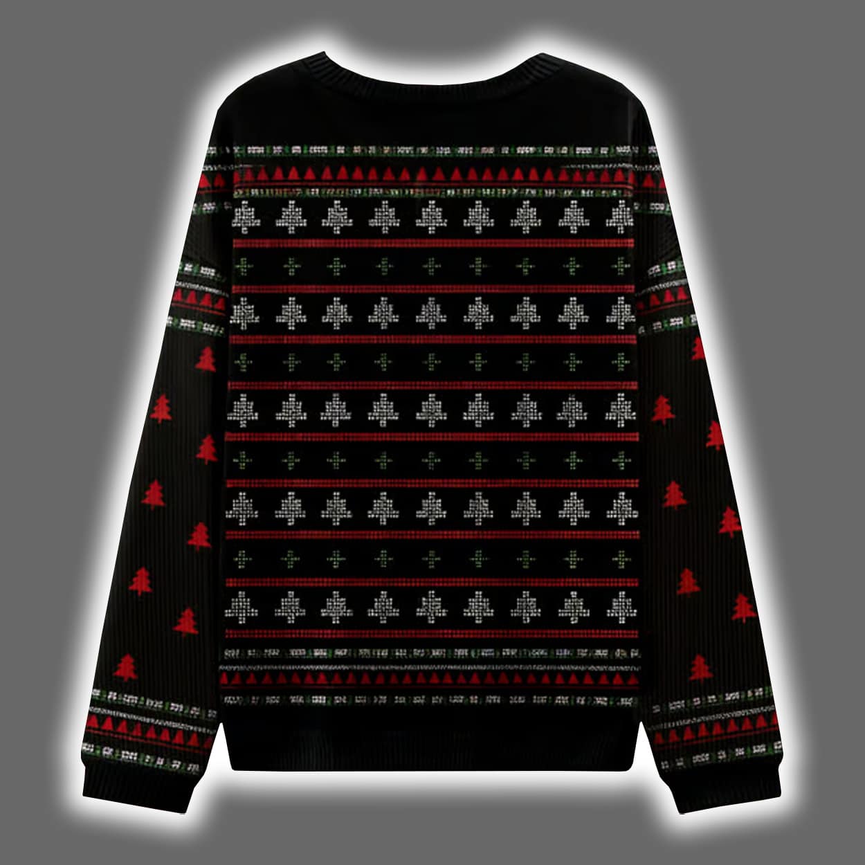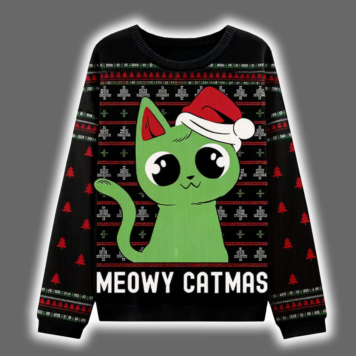 Get ready to sleigh the holiday party circuit with this sweater! This eye-catching design features a wide-eyed green cartoon cat donning a classic red and white Santa hat, front and center. Beneath the feline, bold white lettering spells out “MEOWY CATMAS,” delivering a cheeky seasonal pun that’s impossible to ignore. The black background is decked out with rows of red hearts, green and white stripes, and tiny Christmas trees, creating a festive tapestry that wraps around to the back for full holiday impact.