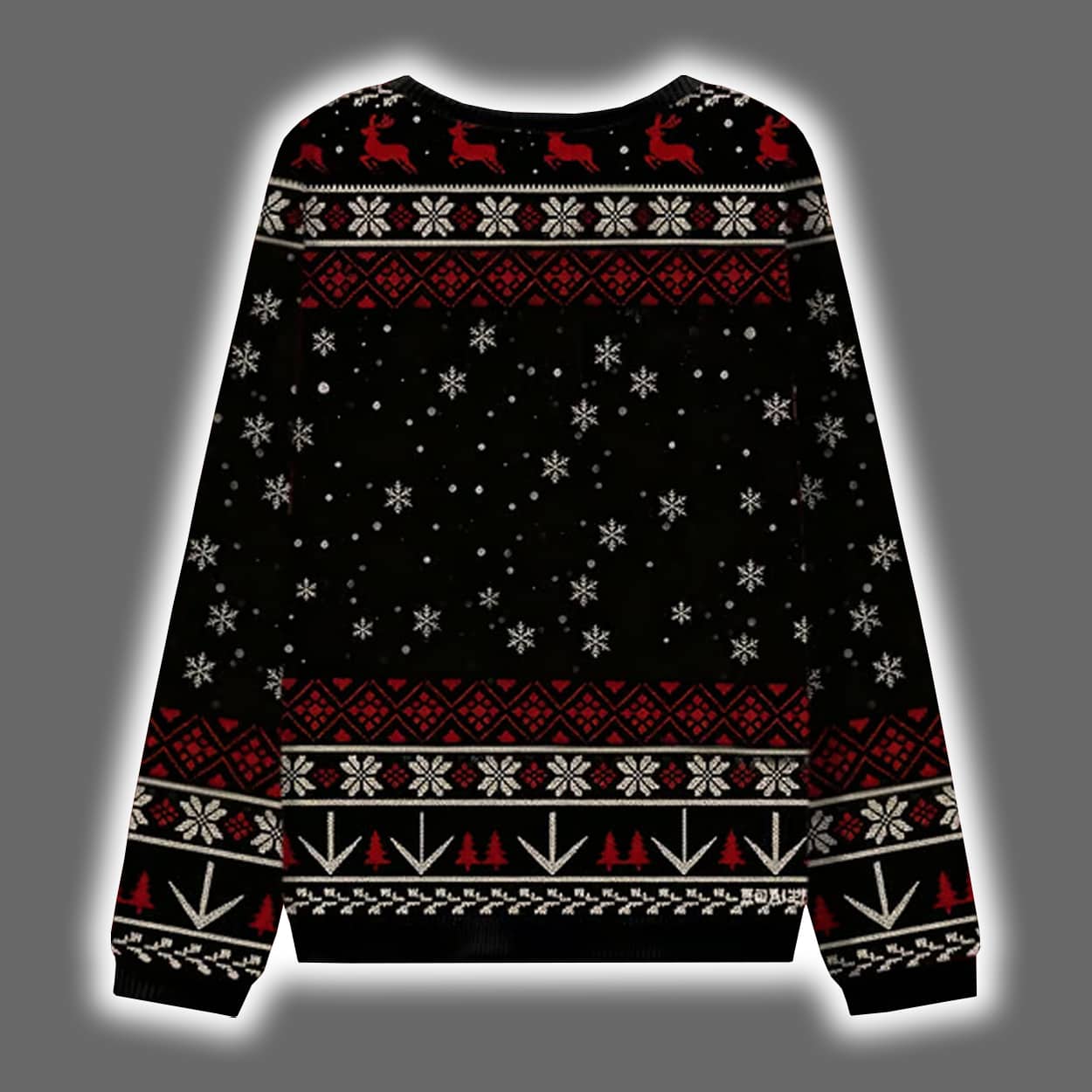 Why settle for ordinary when you can strut into the season with poultry-powered flair? This sweater features two fabulously festive chickens dressed to impress. One rocks a Santa hat and sunglasses, while the other flaunts a comb styled like a Christmas tree—because nothing says holiday spirit like barnyard glam. Above the duo, the word “MERRY” sets the tone, while “CHICMAS” below delivers a pun-packed punch that blends “chicken” and “Christmas” into one clucking clever celebration. Wrapped in classic holiday motifs—snowflakes, reindeer, and geometric patterns in red, white, and black—this sweater is a party on every thread.