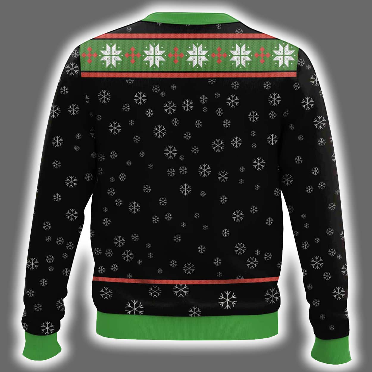 Step aside, Santa—Sterling Archer is taking over the holiday party. This sweater features a bold black base with green accents and a cartoon-style illustration of Archer mid-toast, bottle in one hand, glass in the other. Above him, the phrase “DANGER ZONE” sets the tone, while the punchline “MERRY DRUNK I’M CHRISTMAS” delivers the kind of holiday humor only Archer fans will truly appreciate. Snowflakes and festive red-and-green bands add seasonal charm, while the back keeps it cool with a continuation of the snowflake pattern. It’s the perfect blend of irreverence and holiday spirit.