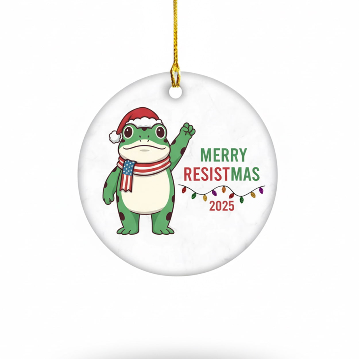 Deck your tree with defiance this year! This ornament features a charming cartoon frog dressed for the season in a red Santa hat and a cozy striped scarf. With a tiny American flag proudly displayed on its chest and one fist raised high, this frog isn’t just festive—it’s fired up. The words “MERRY RESISTMAS 2025” pop in bold green and red beside a string of colorful Christmas lights, adding a playful punch to your holiday décor.