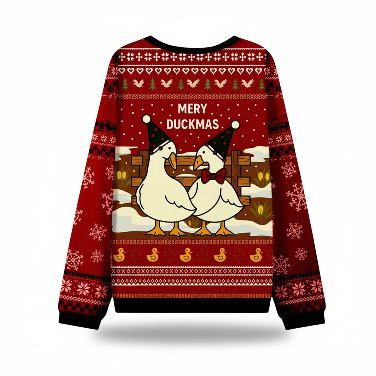 This holiday sweater is a delightful blend of classic Christmas charm and playful absurdity. Dominated by cheerful red tones and sprinkled with white snowflakes and festive patterns, it features two cartoon ducks dressed in cozy winter gear. They stand proudly in front of a snowy village scene complete with quaint houses and frosted trees. Above and below the ducks, the phrase “MERY DUCKMAS” is boldly displayed—a joyful misspelling that adds to the sweater’s quirky appeal. With matching front and back designs, it’s a full-circle celebration of holiday humor.