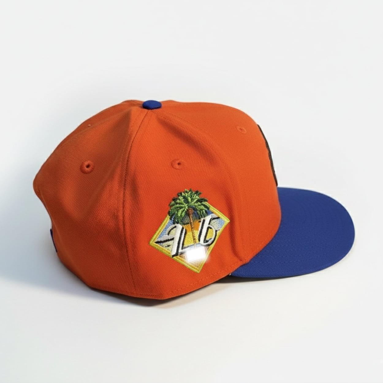This hat is a bold burst of color and character, perfect for fans who love to stand out. Featuring a bright orange crown and a royal blue brim, this cap commands attention from the dugout to the beach. Front and center is a playful embroidered baseball character—grinning in sunglasses and rocking a mini Mets cap—bringing a cheeky twist to traditional team gear. Surrounding the character is a lush tropical motif: green leaves, delicate white flowers, and a juicy orange slice that nods to the citrusy vibes of spring in Florida.