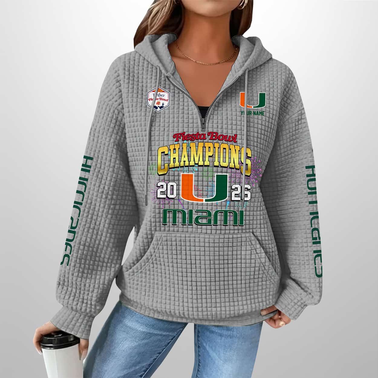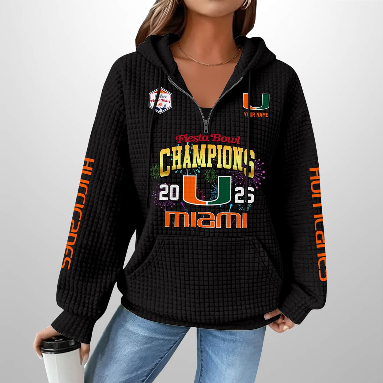 Celebrate the Hurricanes’ 2026 Fiesta Bowl triumph with this Miami Fiesta Bowl Champions 2026 Waffle Zip Hoodie—designed for fans who live loud and rep Miami pride with swagger.