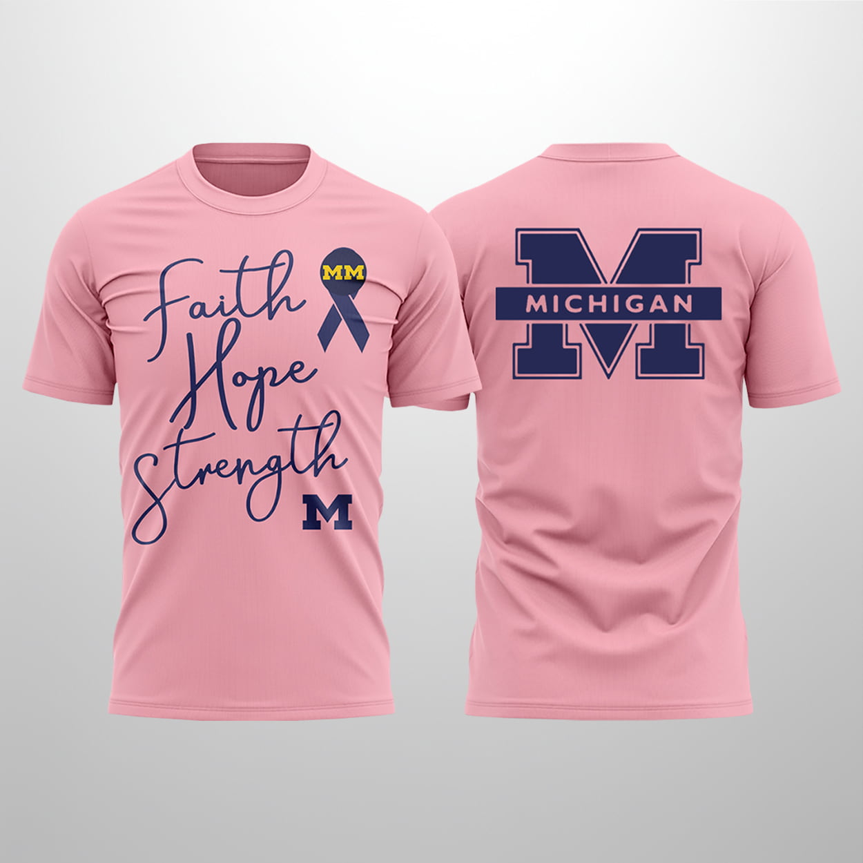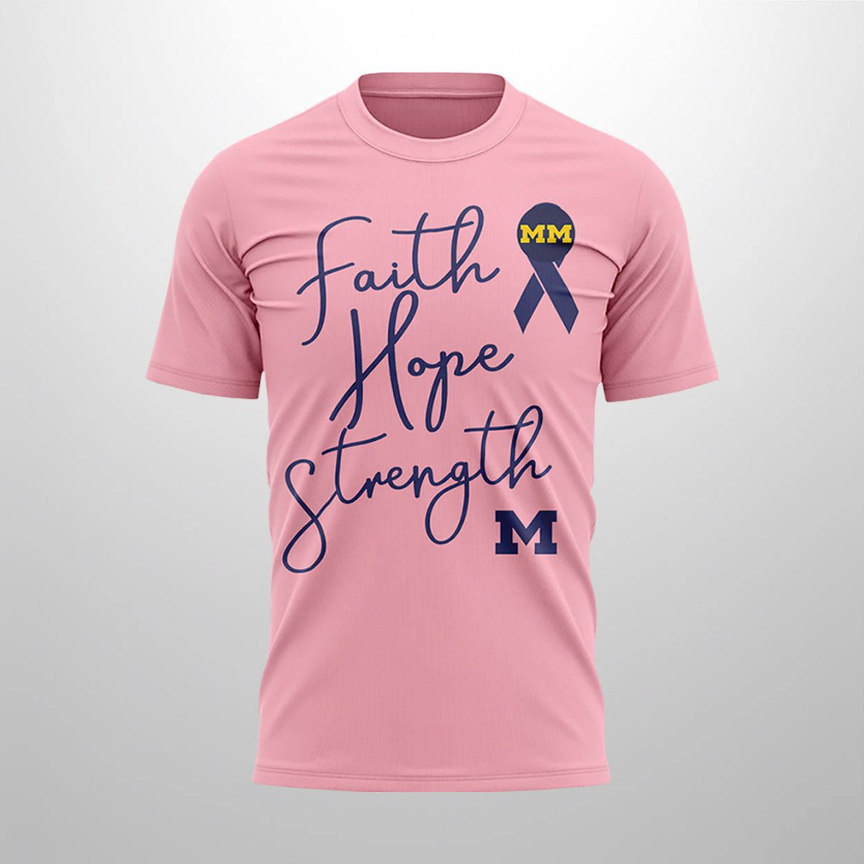 Make a bold statement that goes beyond the scoreboard with this shirt. This eye-catching piece features a vibrant pink canvas that perfectly balances collegiate tradition with a deeply meaningful cause. The front showcases the words “Faith Hope Strength” in an elegant, flowing script, anchored by a classic Michigan “M” and a stylized awareness ribbon adorned with a “MM” emblem. On the back, a large, authoritative block “M” is bisected by a “Michigan” banner, ensuring your school loyalty is visible from every angle.
