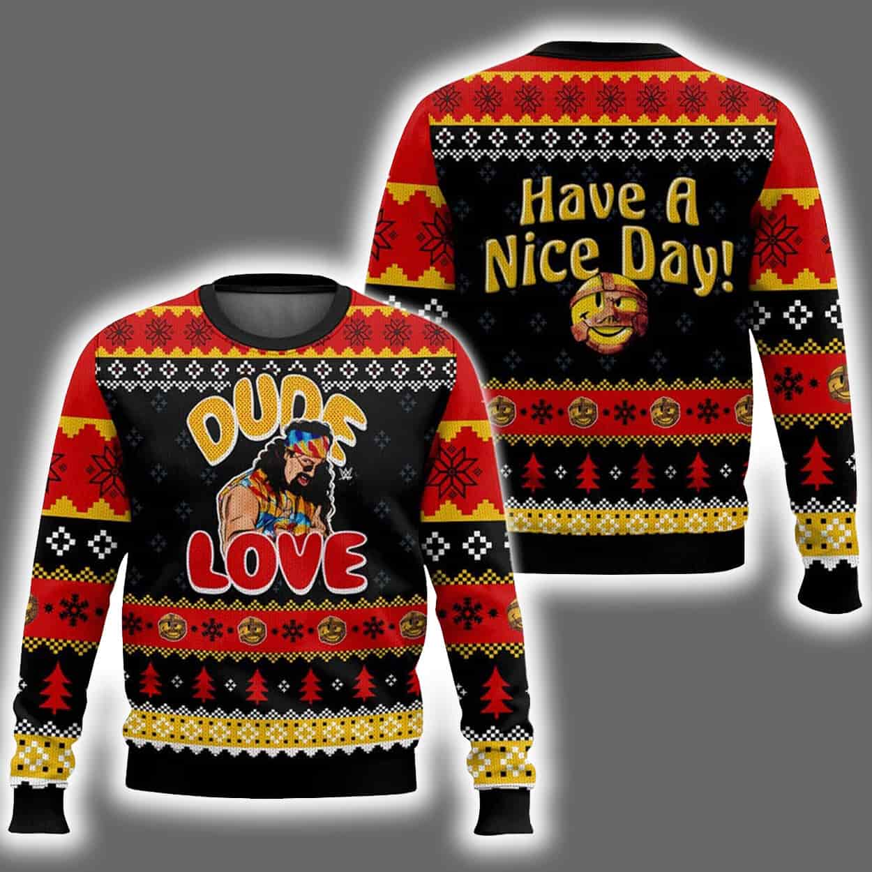 This isn’t your grandma’s Christmas sweater—it’s a psychedelic explosion of holiday spirit and wrestling nostalgia. The front features the iconic “DUDE LOVE” text alongside a vibrant illustration of Mick Foley’s alter ego, complete with sunglasses, a headband, and tie-dye shirt. Traditional holiday patterns—snowflakes, trees, and geometric designs—dance across the red, black, yellow, and white backdrop. Flip it around and you’ll find the cheerful message “Have A Nice Day!” paired with a smiling yellow face rocking a goatee and shades.