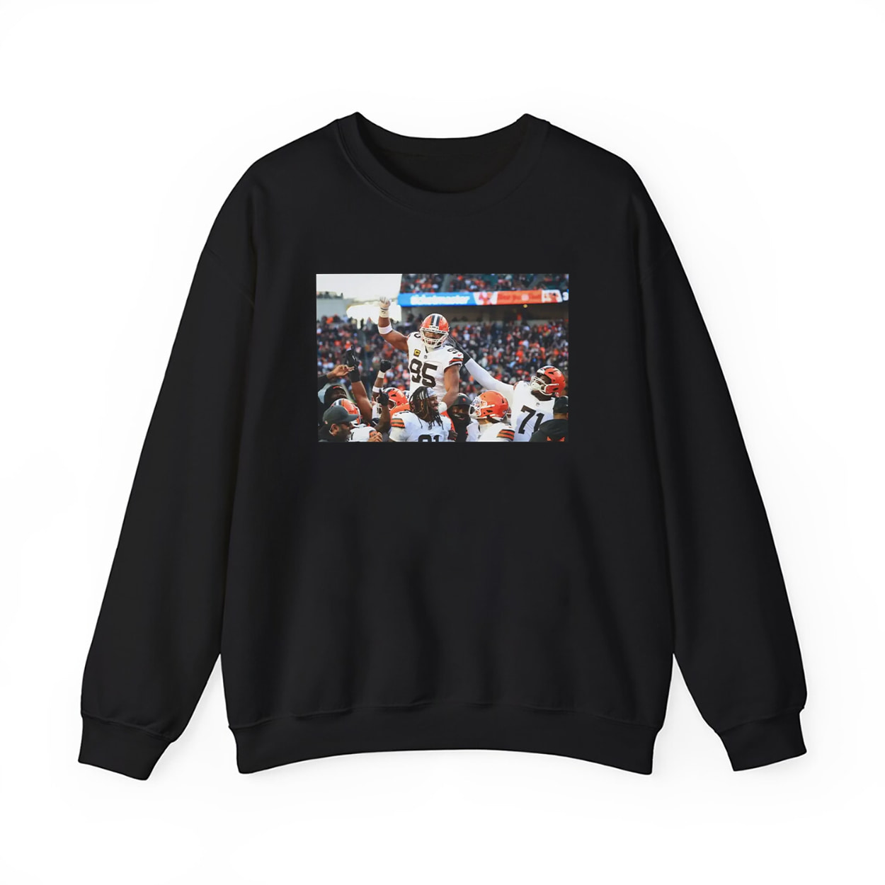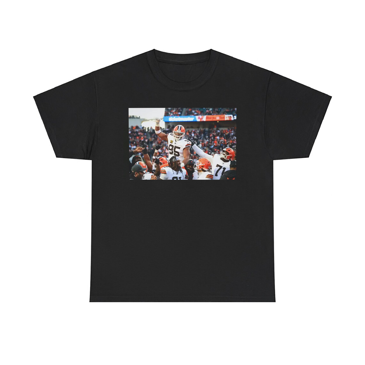 This shirt isn’t just apparel—it’s a snapshot of history. Featuring a vivid print of Myles Garrett hoisted high by his teammates after breaking the Browns’ sacks record, this tee captures the raw emotion and unity of a team rallying behind its star. The stadium roars in the background, fans on their feet, and Garrett—jersey #95—soars above it all, immortalized in a moment of triumph. It’s the kind of shirt that turns heads, starts conversations, and reminds everyone what greatness looks like.