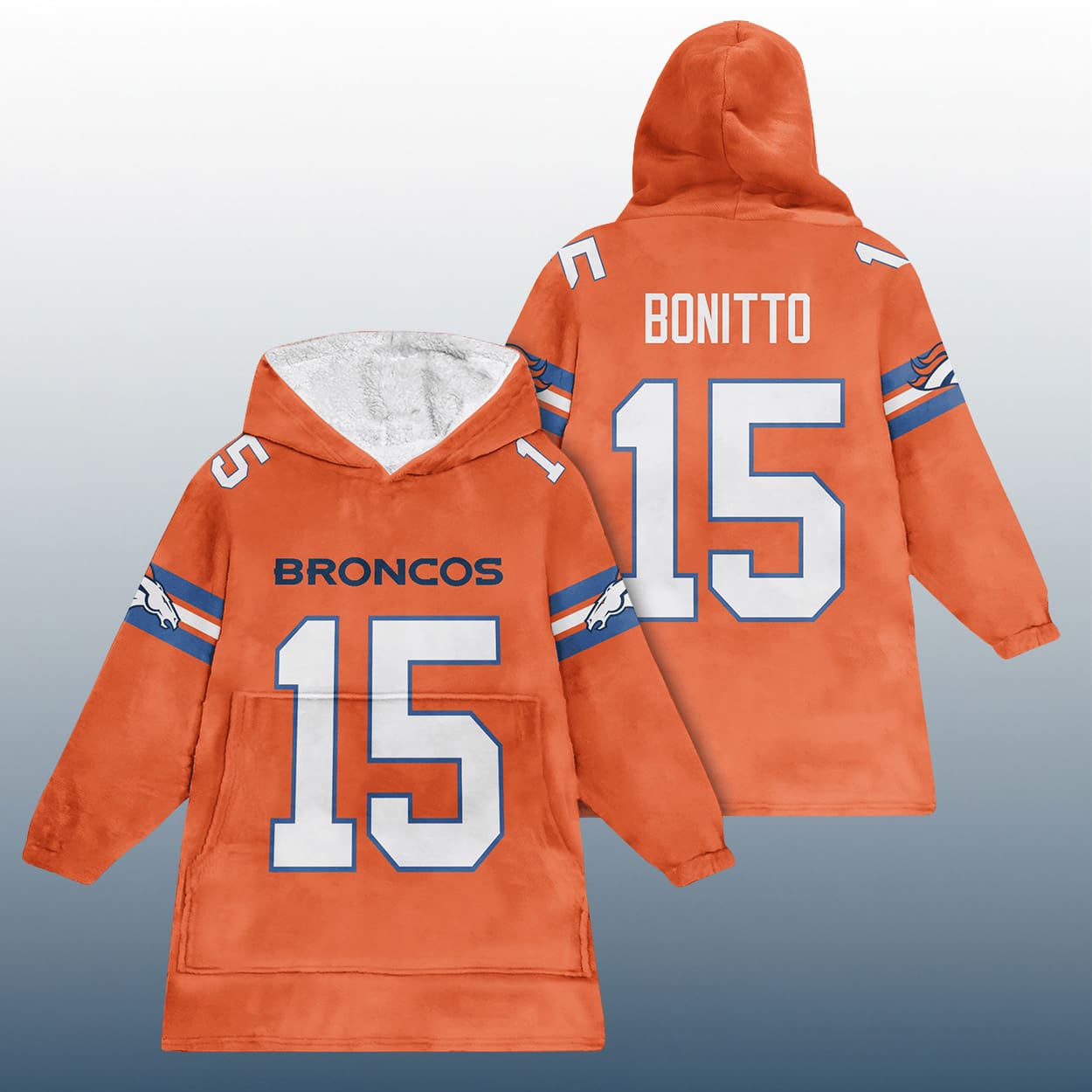 Say hello to the ultimate fan favorite. This hoodie brings the energy of the gridiron straight to your wardrobe. Drenched in vibrant orange with crisp blue and white accents, it features the number “15” front and center in bold white digits outlined in blue. Above it, “BRONCOS” blazes across the chest like a rallying cry. The sleeves carry the number again, flanked by racing stripes and the iconic horse logo. Flip it around and you’ll find “BONITTO” proudly displayed above the number 15, making it clear this hoodie is a nod to Denver’s dynamic defender.