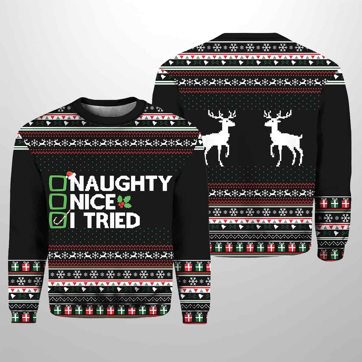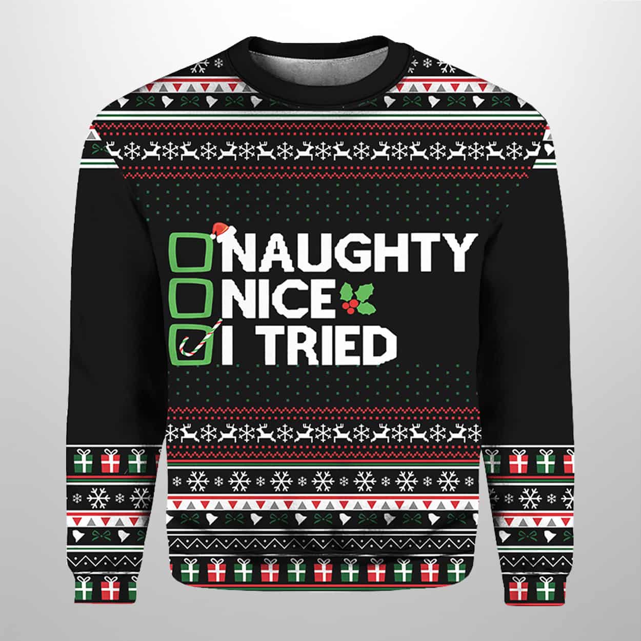 Own your holiday effort with the Naughty Nice I Tried Ugly Christmas Sweater—festive, funny, and totally relatable.