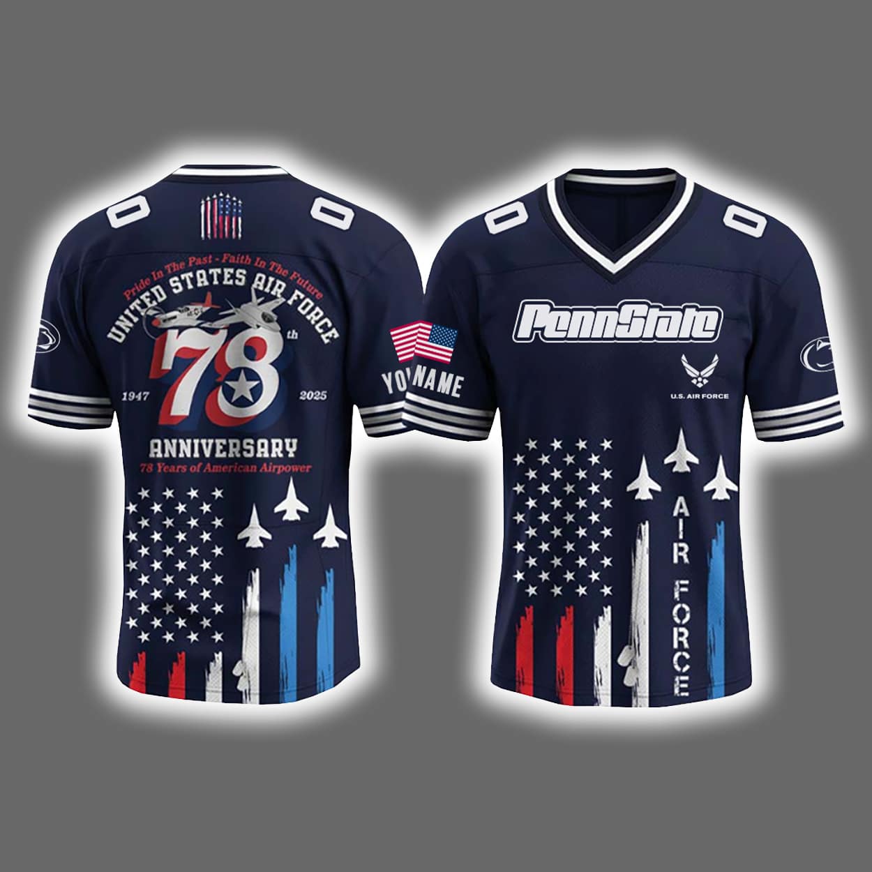 This isn’t just a jersey—it’s a salute in stitches. This jersey fuses collegiate pride with military honor in a design that commands attention. The front proudly displays “PennState” across the chest, flanked by soaring fighter jets and bold vertical “AIR FORCE” lettering. Red, white, and blue stripes streak down the side like contrails in the sky. On the sleeves, you’ll find a customizable “YOU NAME” patch beneath the American flag and a striking eagle emblem that seals the look with authority.