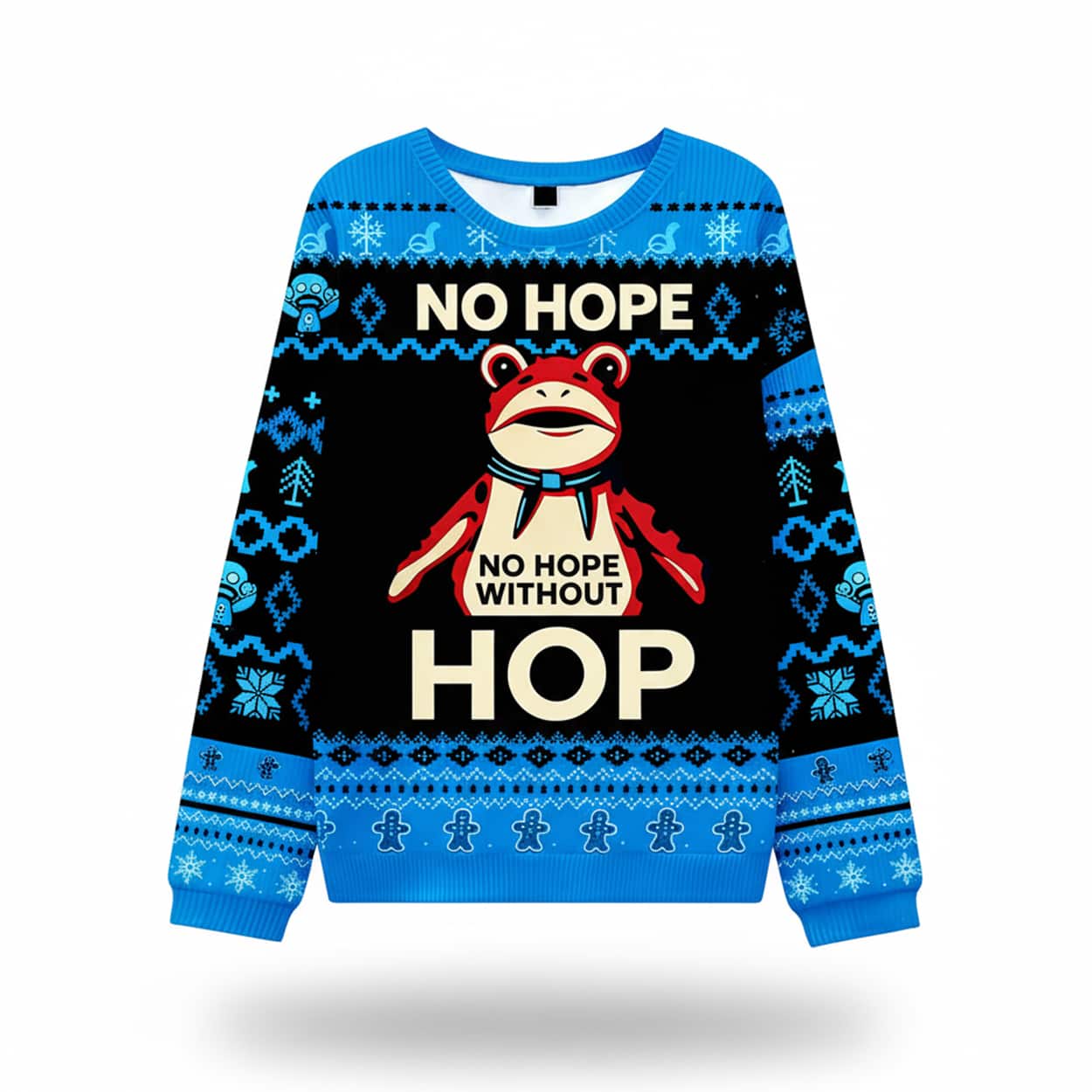 The Portland Frog emerged from the 2025 protests in Portland, Oregon, becoming a viral symbol of peaceful resistance and playful defiance. This sweater channels that spirit—combining holiday humor with a nod to civic engagement. The phrase “No Hope Without Hop” riffs on the frog’s leap and the human need for hope, reminding wearers that joy and justice go hand in hand.