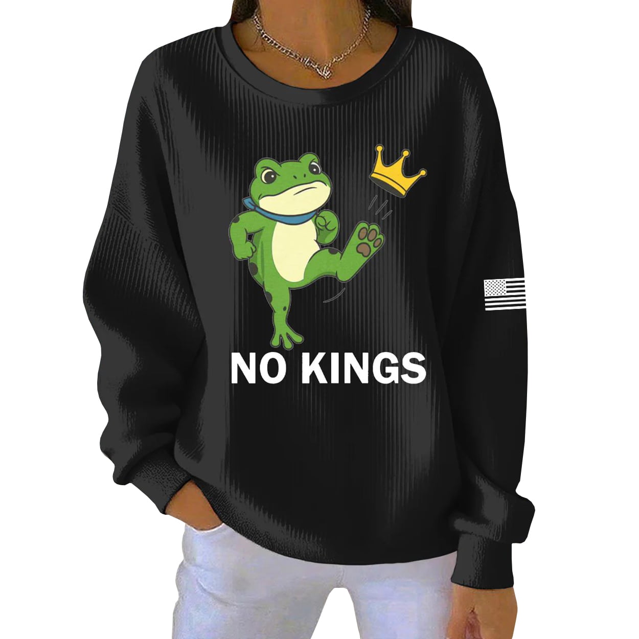 Step into streetwear with a smirk in this sweatshirt. This standout piece features a cartoon frog mid-kick, launching a golden crown into oblivion—because royalty’s overrated. Beneath the action, bold white lettering declares “NO KINGS,” making your stance unmistakable. A stylized American flag graphic on the sleeve adds a subtle nod to rebellion, while the ribbed texture and relaxed fit keep things effortlessly cool. Whether you’re strolling through the city or making a statement at a gathering, this sweatshirt speaks volumes without saying a word.
