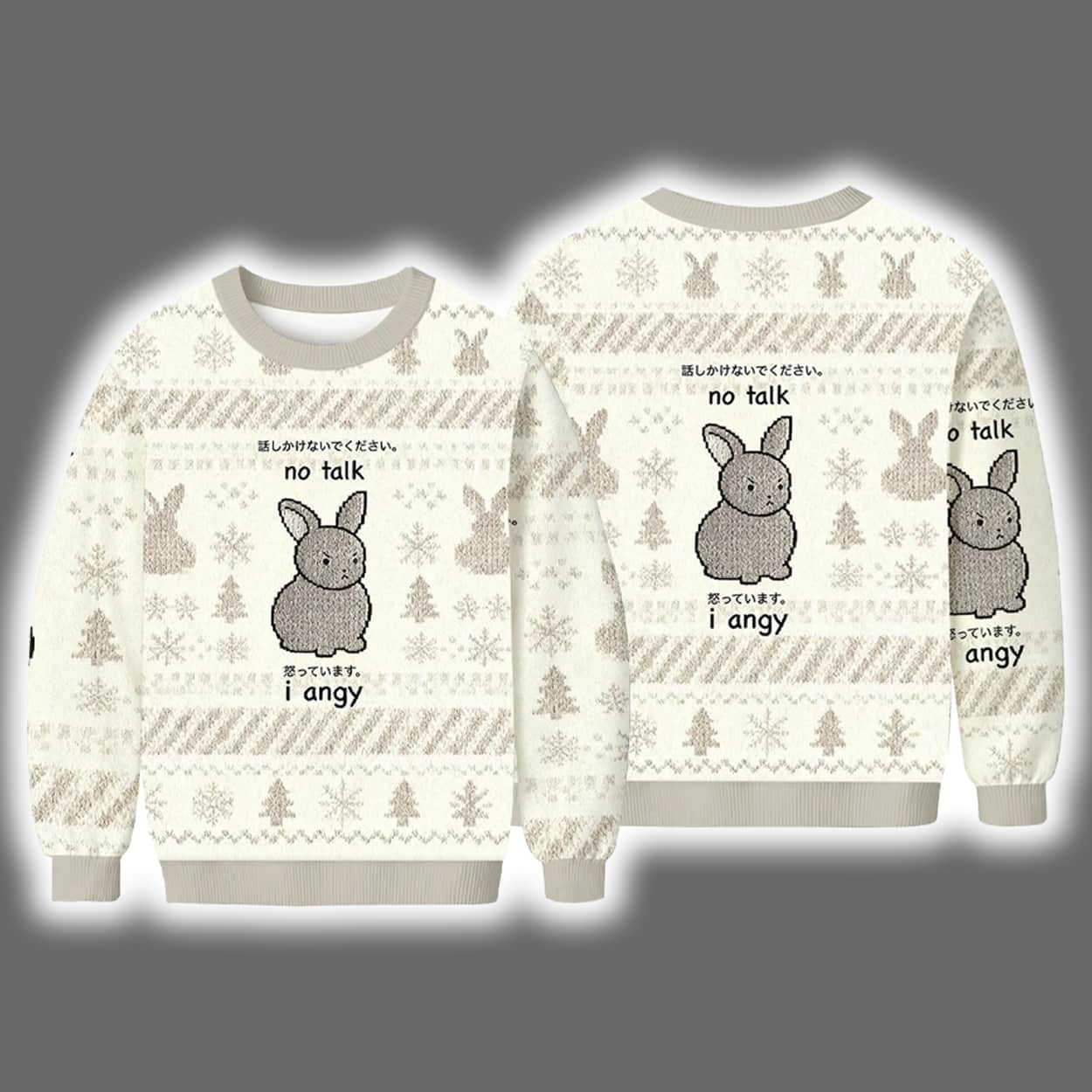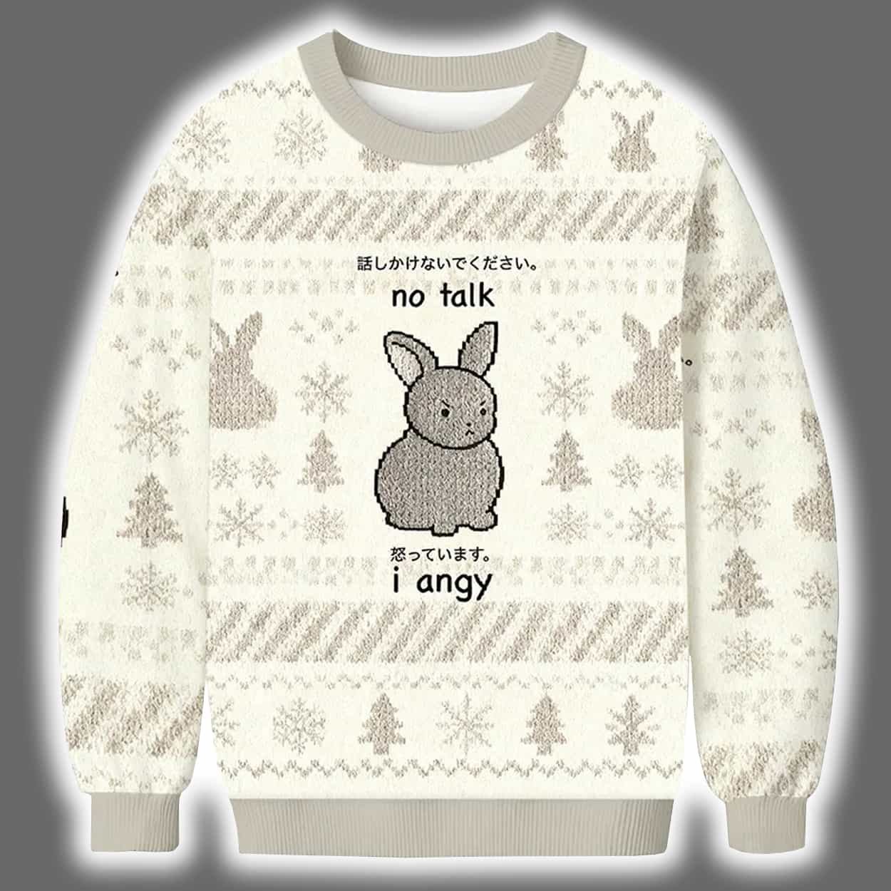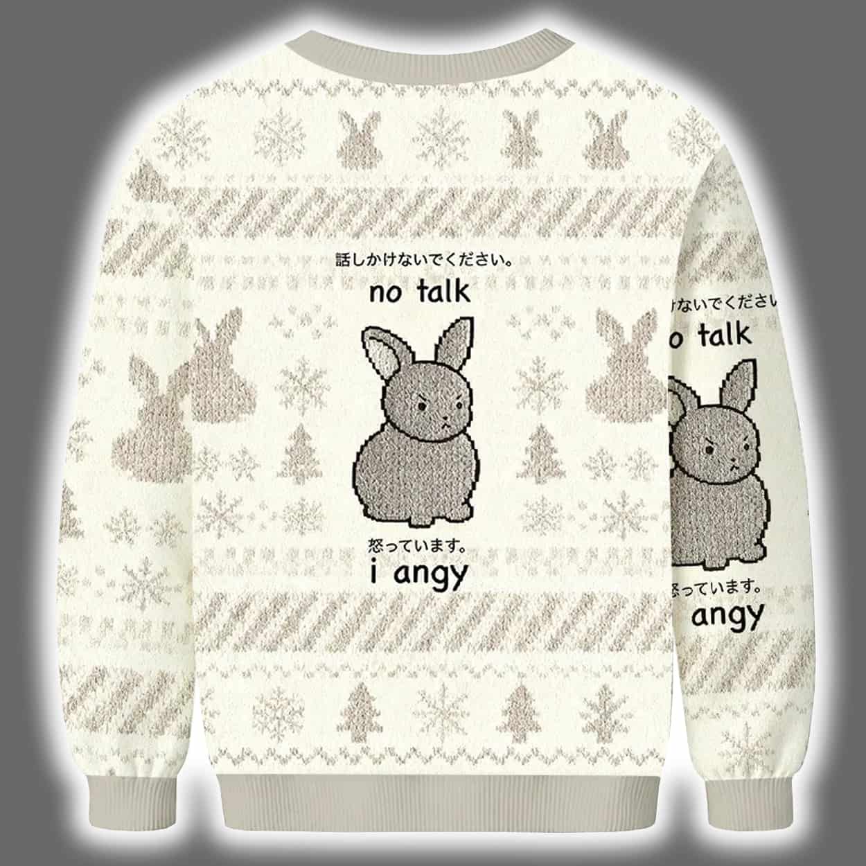 Make a bold, hilarious statement this holiday season with this sweater. Featuring a soft beige and white color scheme, this festive piece is decorated with classic seasonal motifs—snowflakes, Christmas trees, and adorable rabbits—arranged in cozy horizontal patterns. At the center of both the front and back is a cartoon gray bunny, wide-eyed and clearly not in the mood. Surrounding the bunny is a cryptic yet relatable message: “no bunny can know. no talk. but what if. i angy.” It’s the perfect visual representation of holiday overwhelm, wrapped in cuteness and chaos.