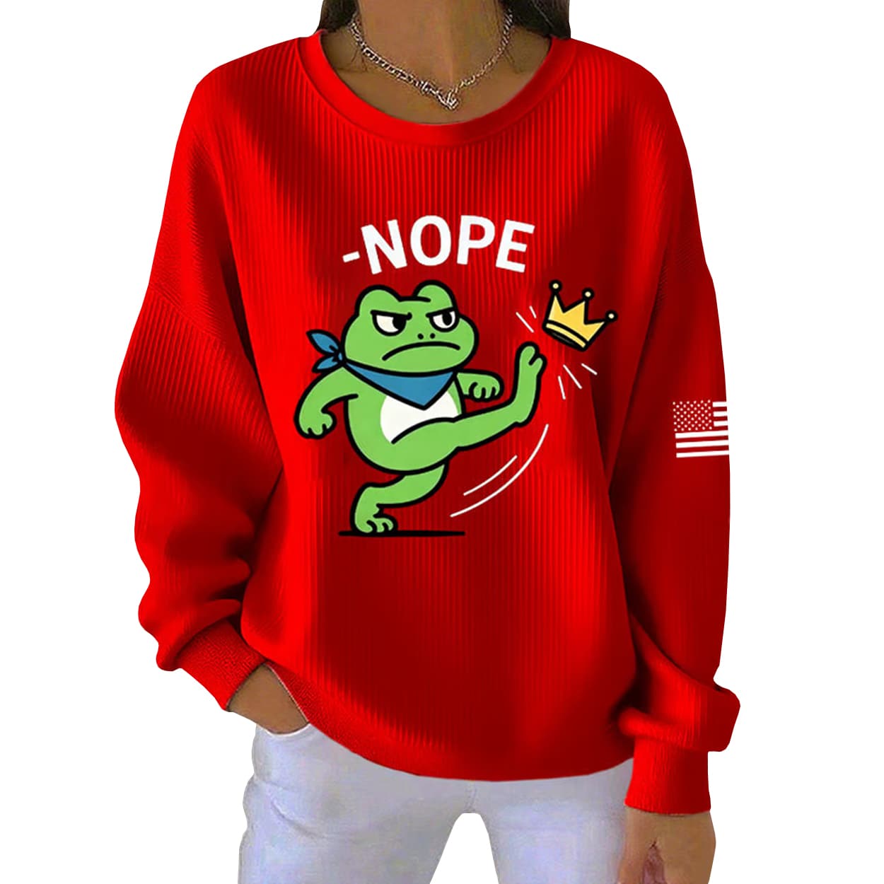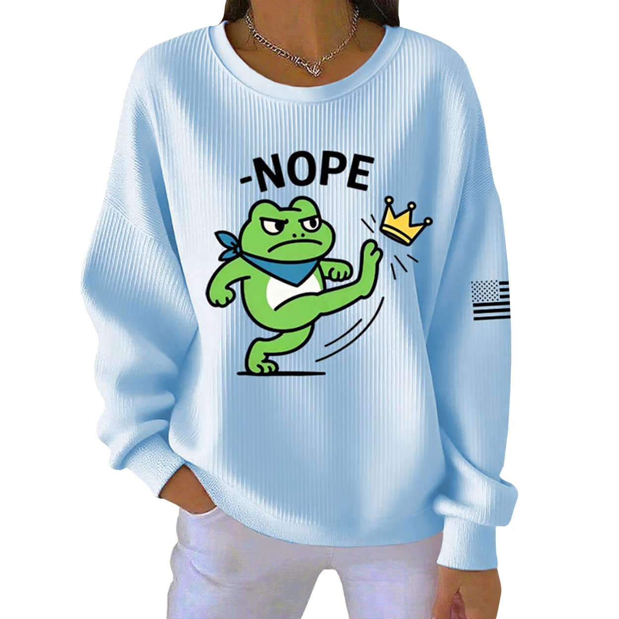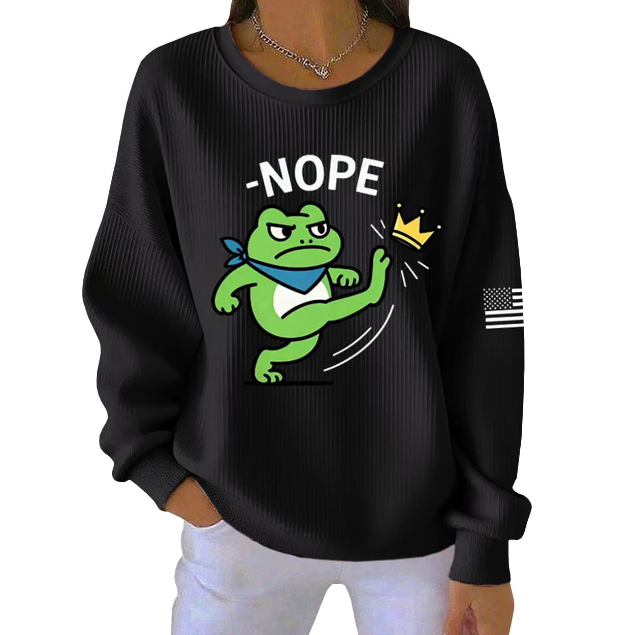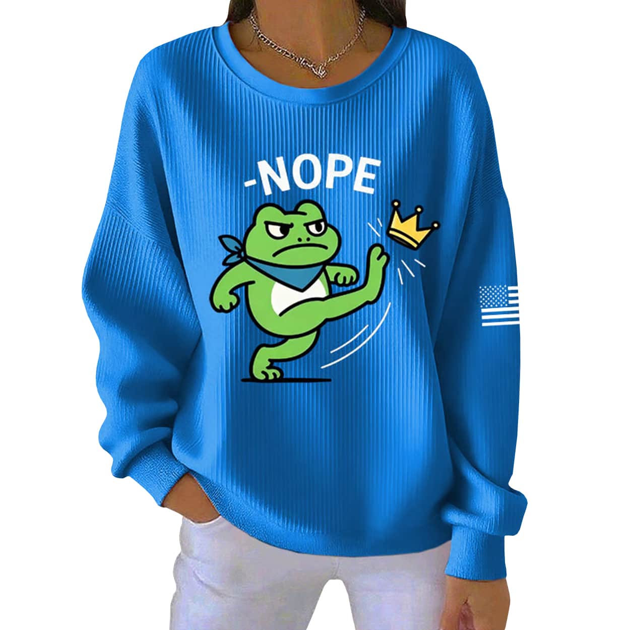 This ribbed sweatshirt is more than just cozy streetwear—it’s a punchy piece of protest art. Front and center is the infamous Portland Frog, scowling with attitude, decked out in a blue bandana and white gear, mid-kick as he launches a golden crown into oblivion. Above him, the bold black “NOPE” makes the message unmistakable: no kings, no rulers, no nonsense. A subtle black-and-white American flag patch on the sleeve adds a gritty edge, making this sweatshirt a wearable declaration of independence.