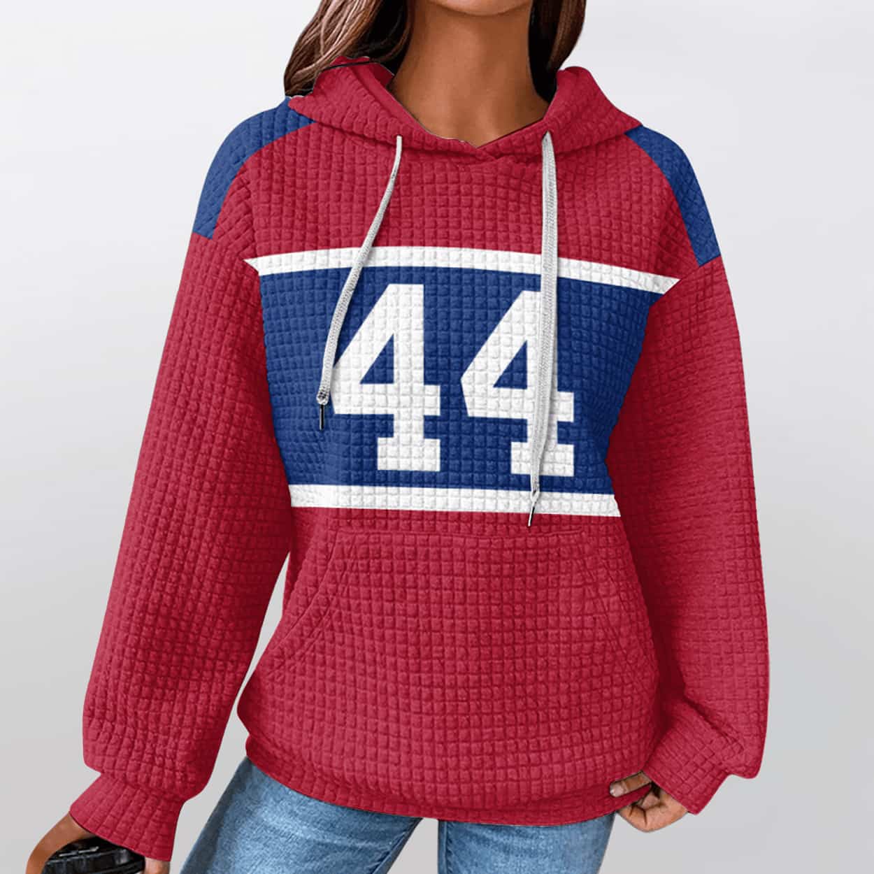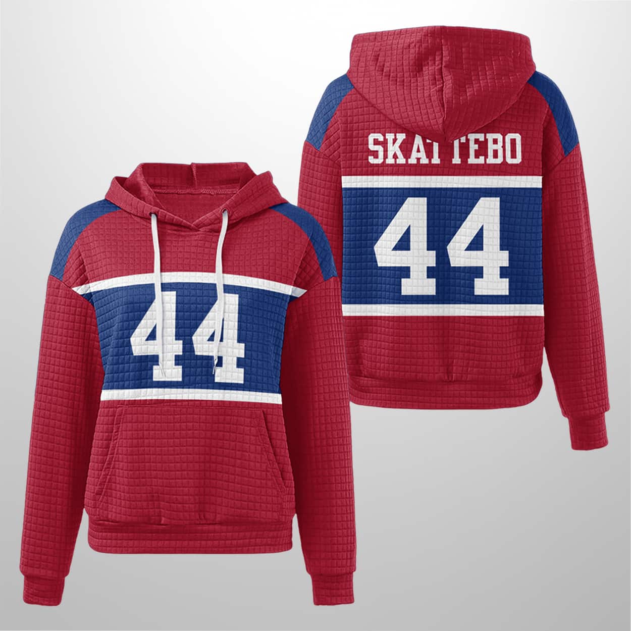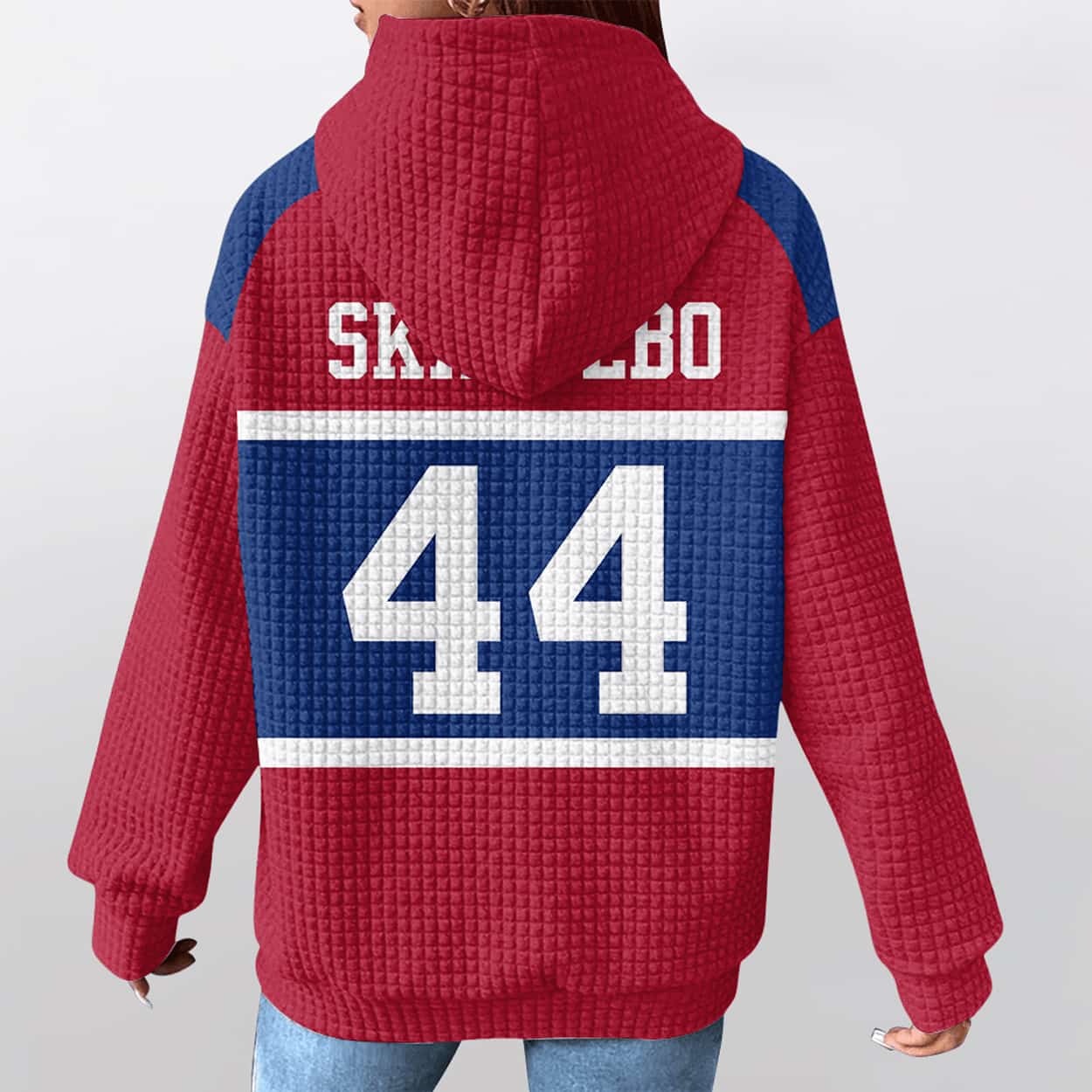 Get ready to turn heads with this hoodie — a vibrant fusion of athletic energy and urban edge. This red hoodie packs a punch with the number 44 front and back, boldly printed in white on a blue rectangular backdrop. A crisp white stripe slices beneath the digits, adding contrast and flair. The hood pops in Giants blue with white drawstrings, and the textured waffle pattern gives it a street-smart vibe. On the back, “SKATEBO” rides above the number, adding a playful twist that’s equal parts nickname and attitude.