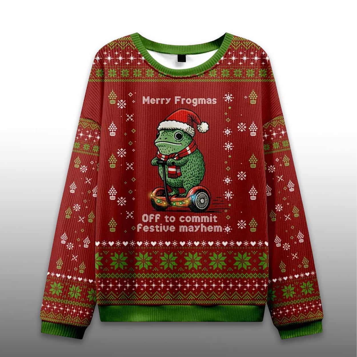 This Off To Commit Frogmas Festival Mayhem Ugly Christmas Sweater comes in a festive red and green “knit-style” design, covered in holiday patterns and pixelated trees. The front wishes everyone a “Merry Frogmas” and features the star of the show: a determined green frog in a Santa hat and scarf, riding a hoverboard. The entire scene is set above the main slogan, “Off to commit festive mayhem,” while the back of the sweater also wishes a “Merry Frogmas.”