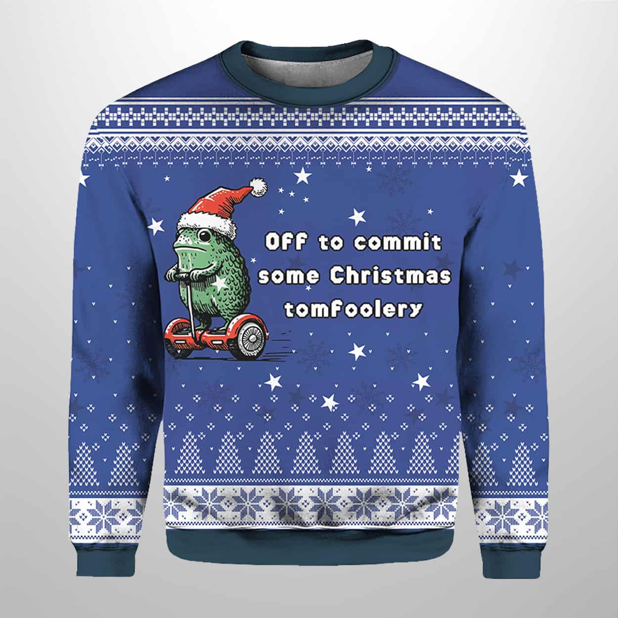 The inspiration behind this design is pure, unadulterated, holiday mischief! Central to the sweater is an adorable, round cartoon frog wearing a jaunty Santa hat. Even better, the frog is depicted zipping away on a miniature red Segway/hoverboard, adding an unexpected and hilarious modern twist. This image perfectly complements the text: “Off to commit some Christmas tomfoolery,” printed in a bold, festive font.