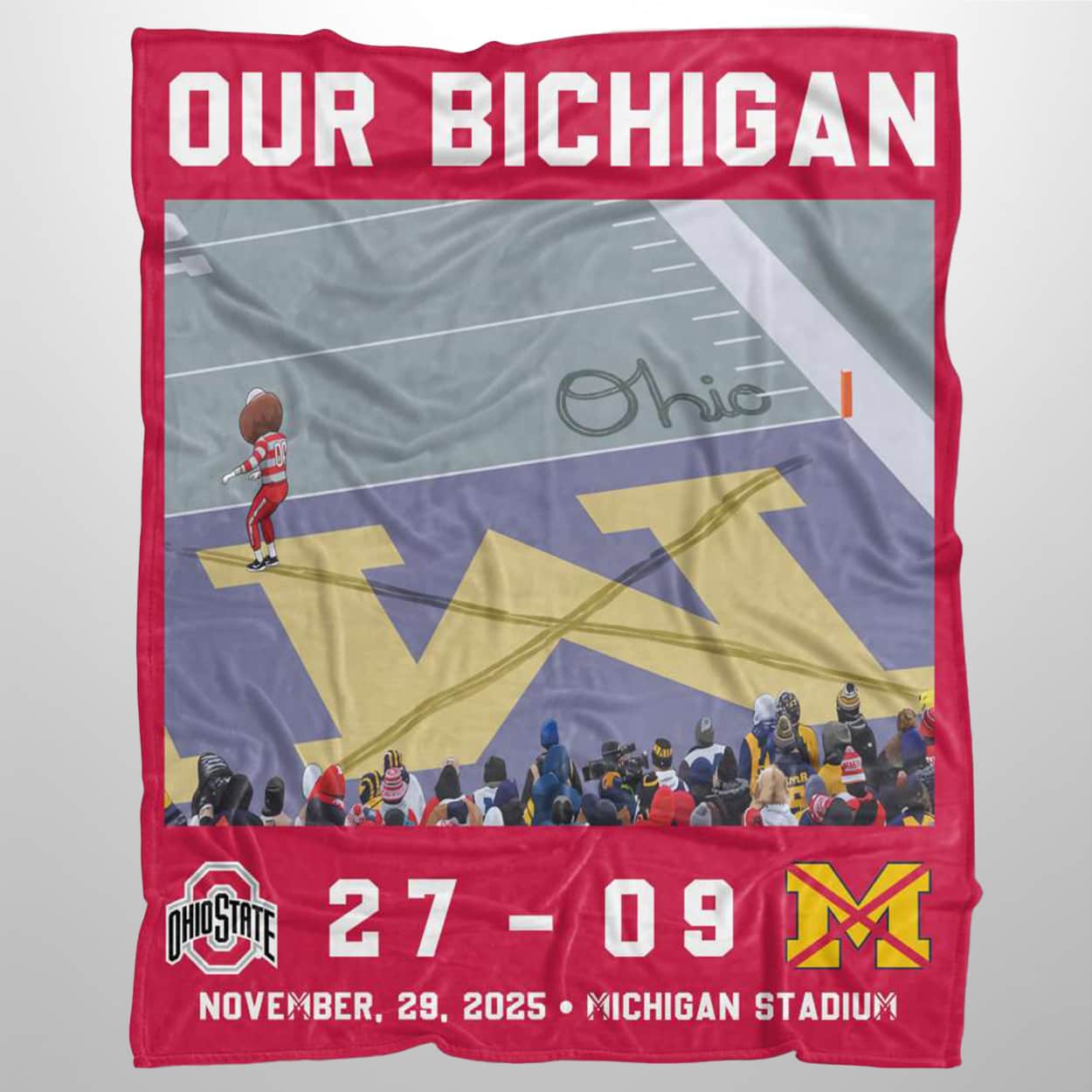 Wrap yourself in victory with this blanket. This vibrant design features a football field dominated by a giant yellow “M” logo—only to be cheekily walked over by Brutus Buckeye himself. The word “Ohio” is scrawled across the field in proud cursive, while the top boldly reads “OUR BICHIGAN,” flipping the rivalry on its head. At the bottom, the scoreboard tells the tale: Ohio State 27, Michigan 09, with the date and location—November 29, 2025, Michigan Stadium—etched in for posterity.