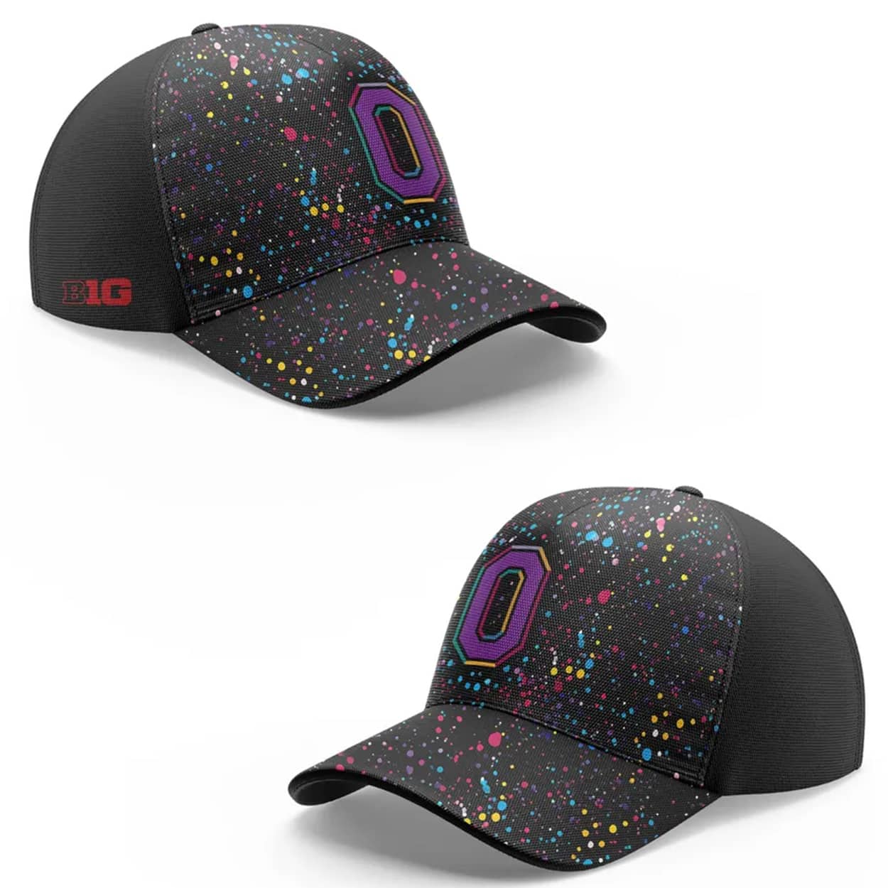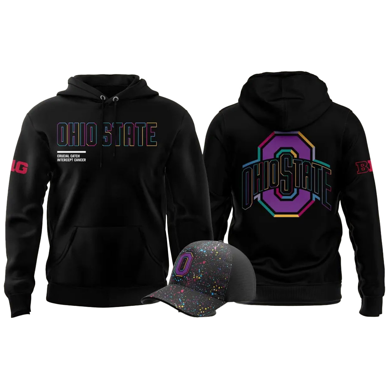 Turn heads and rally the crowd with this set. This hoodie features “OHIO STATE” in a vibrant, multicolored outline font across the chest, with “OHIO STATE CRUCIAL CATCH INTERCEPT CANCER” stamped below in crisp white—because you’re not just a fan, you’re part of the heartbeat. On the back? A show-stopping oversized “O” logo in electric purple, teal, and pink outlines, radiating energy and school spirit. Top it off with the matching cap—black with a speckled burst of color and a stylized “O” front and center. It’s not just gear—it’s a vibe.