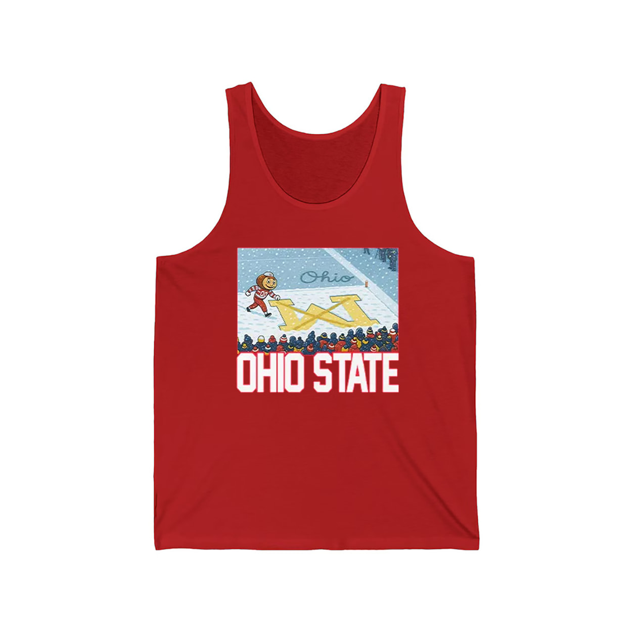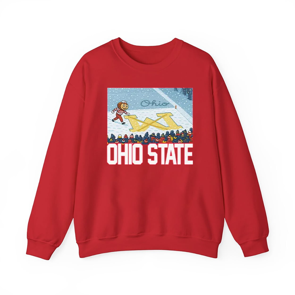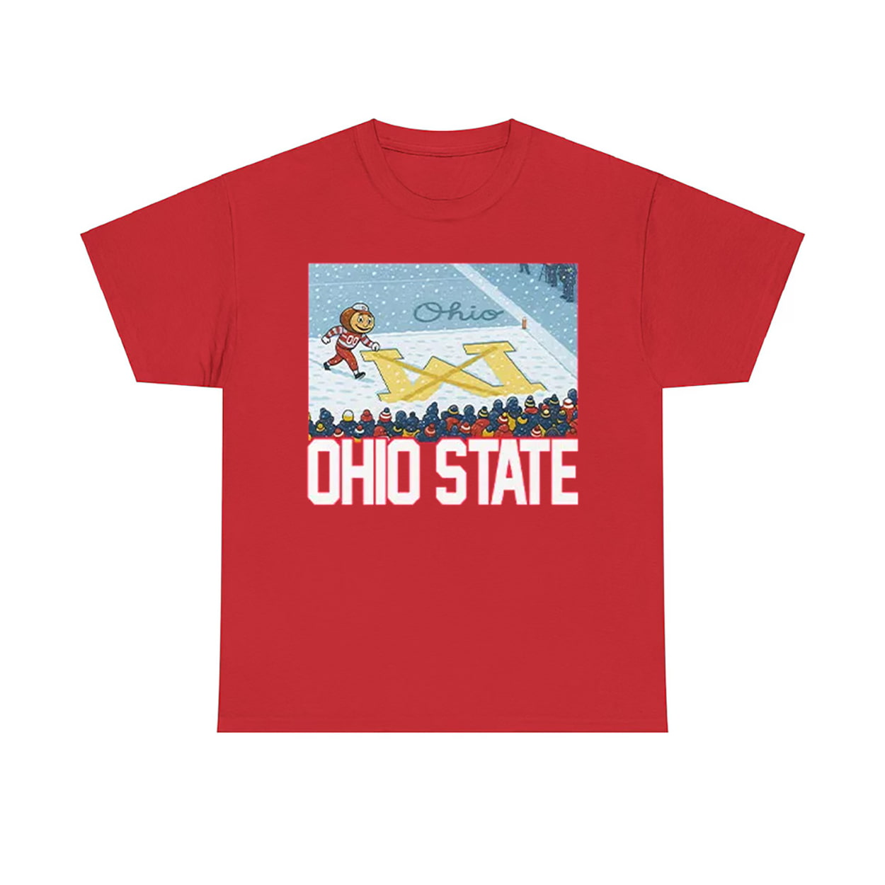 This eye-catching red tee captures the spirit of victory and rivalry in one unforgettable design. Front and center, Brutus Buckeye skates across a frozen field, carving a massive Script Ohio right over Michigan’s iconic block “M.” Above the scene, “Ohio” glides in cursive like a triumphant signature, while “OHIO STATE” stands proud in bold white letters below. Snowflakes, cheering fans, and a wintery backdrop make this shirt a seasonal celebration of Buckeye pride — and a not-so-subtle dig at the Wolverines.