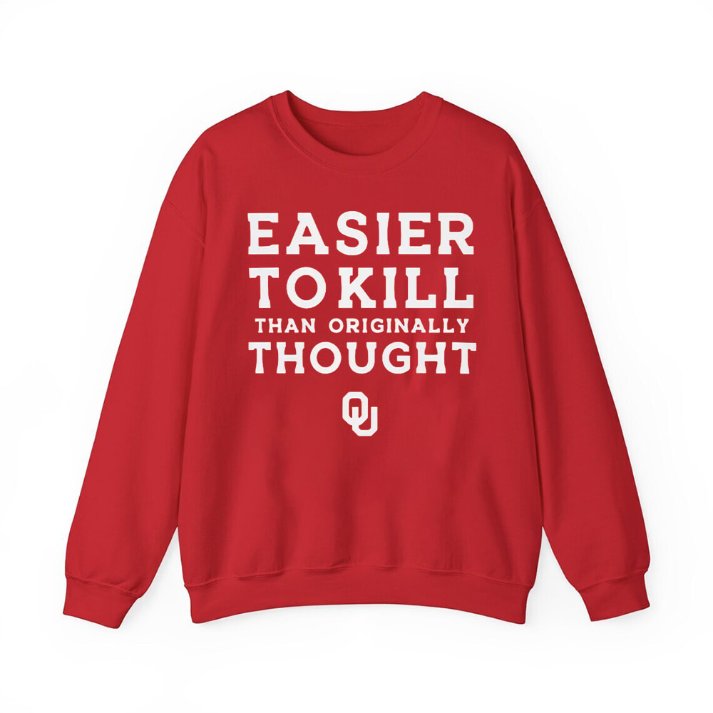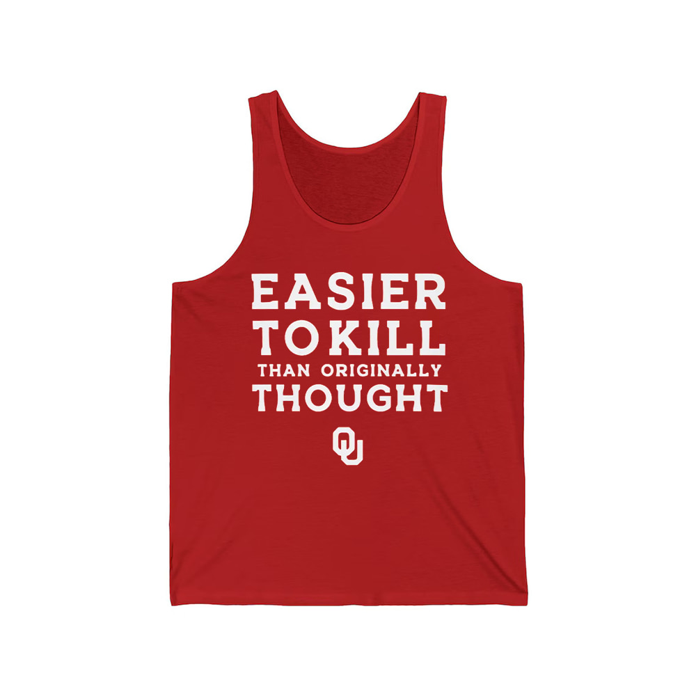Embrace the self-deprecating humor of Sooner Nation with this Oklahoma Easier To Kill Than Originally Thought Shirt. Perfect for the fan who can laugh through the pain and stay loyal. Grab this hilarious piece of college football commentary today.