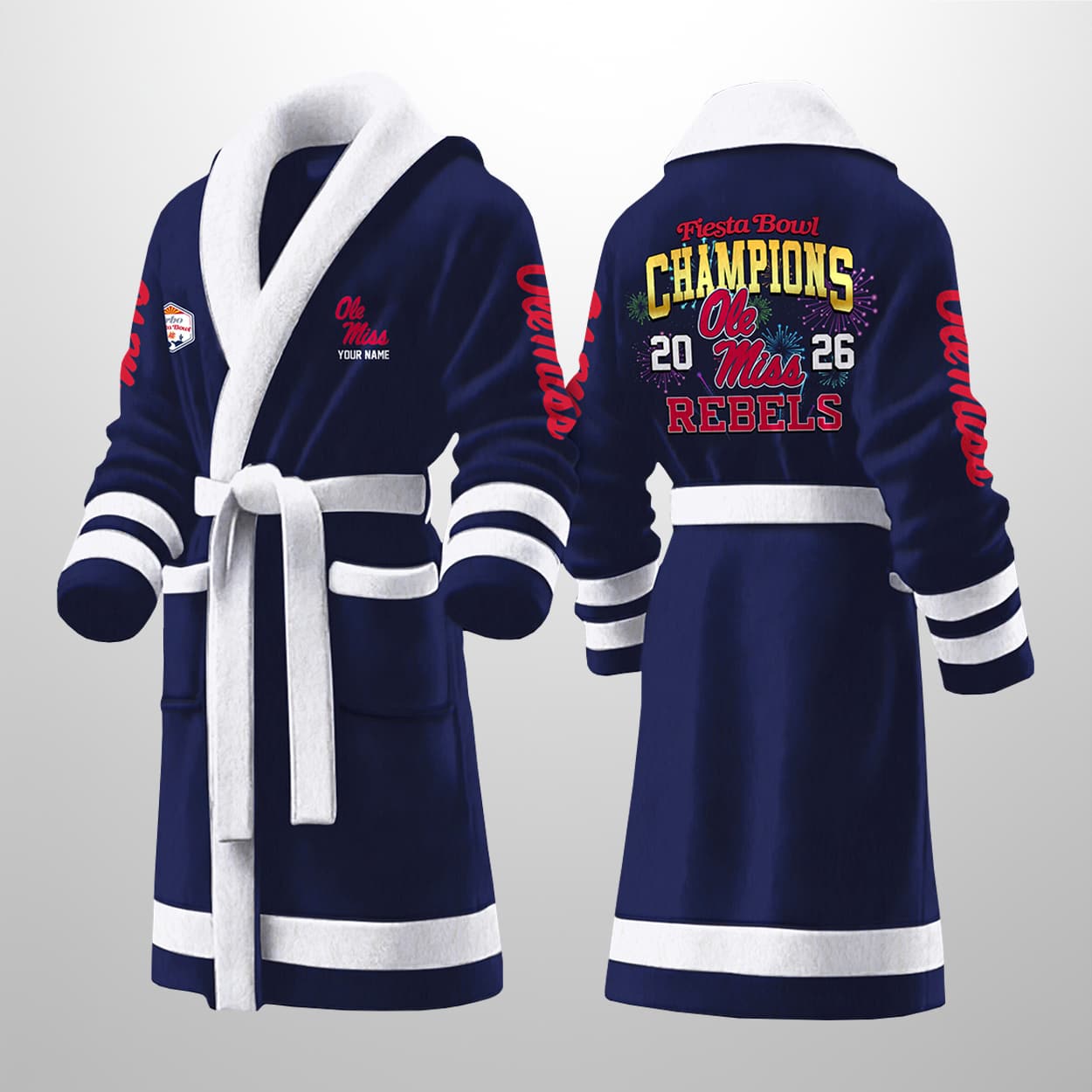Wrap yourself in winning spirit with this bathrobe—a navy blue masterpiece that turns post-shower moments into post-game celebrations. With crisp white accents on the belt, cuffs, and collar, this robe is embroidered with pride. The front features “Ole Miss” in bold red and “REBELS” in white, while the sleeve flashes “CHAMPIONS” in fiery red. But the real showstopper is the back: “Fiesta Bowl,” “CHAMPIONS,” “Ole Miss,” “2026,” and “REBELS” printed in triumphant red, yellow, and white. It’s not just a bathrobe—it’s a wearable victory lap.