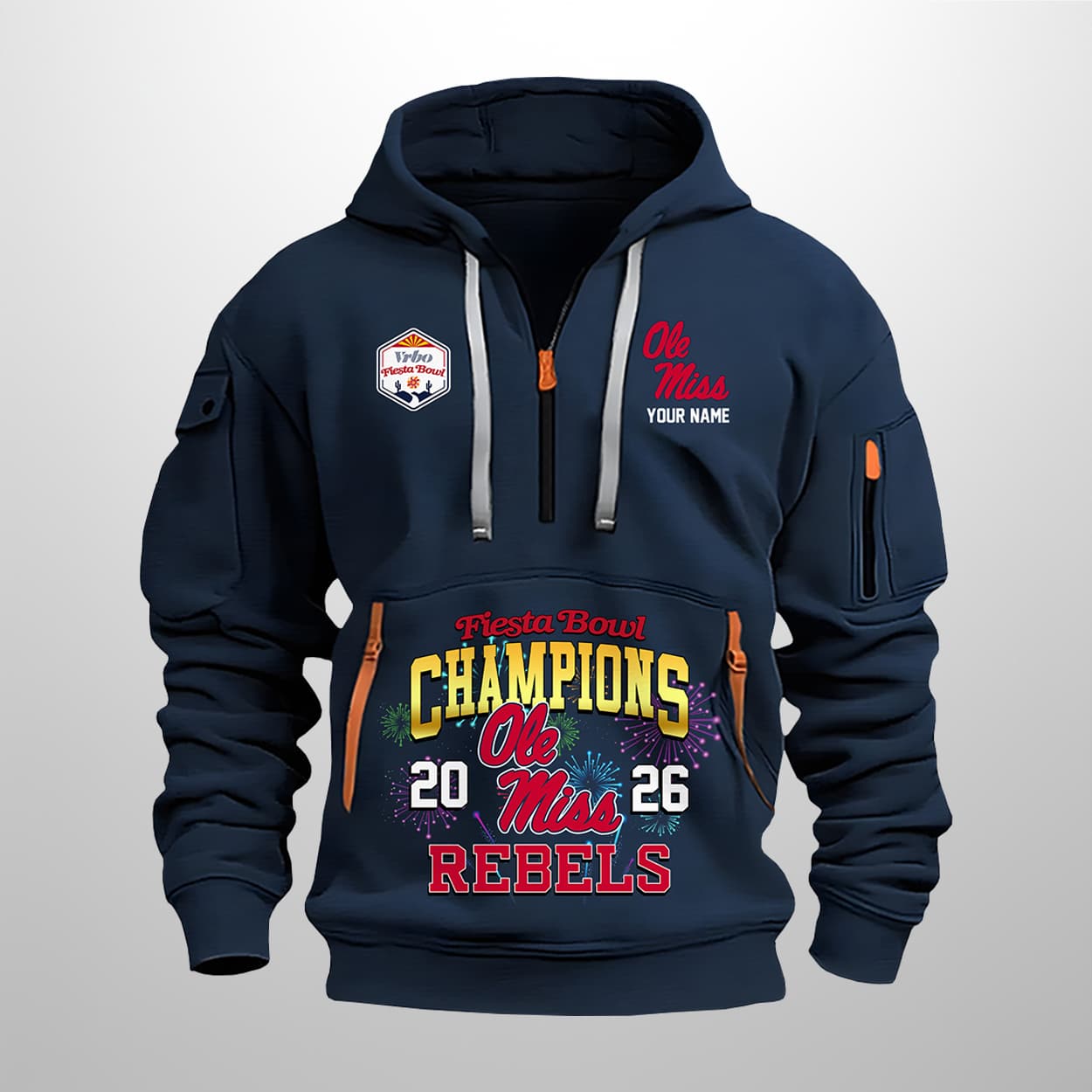 Celebrate the Rebels’ 2026 Fiesta Bowl victory with this Ole Miss Fiesta Bowl Champions 2026 Quarter Zip Hoodie—customizable, bold, and built for fans who live loud and think bigger.