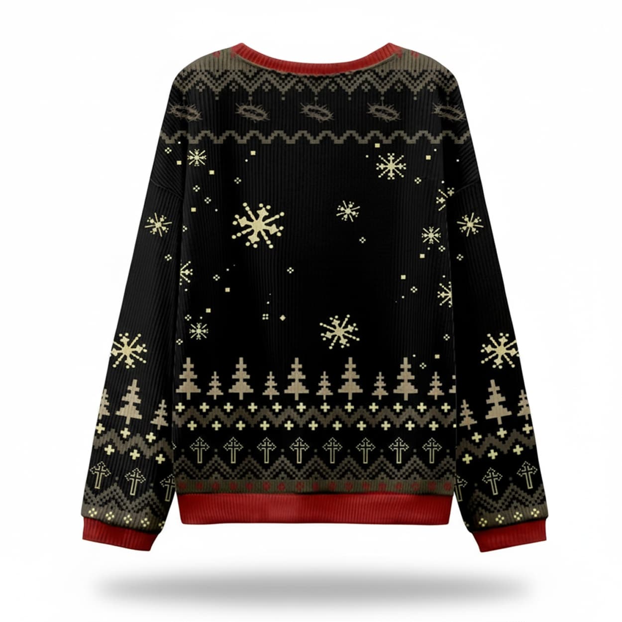 This sweater is for those who love to mix wit with wisdom. It playfully critiques miscommunication and dogma, inviting wearers to reflect, laugh, and maybe even spark a deeper conversation. Whether you’re the theologian of the friend group or just appreciate a good facepalm moment, this design is your seasonal soapbox—wrapped in tinsel.