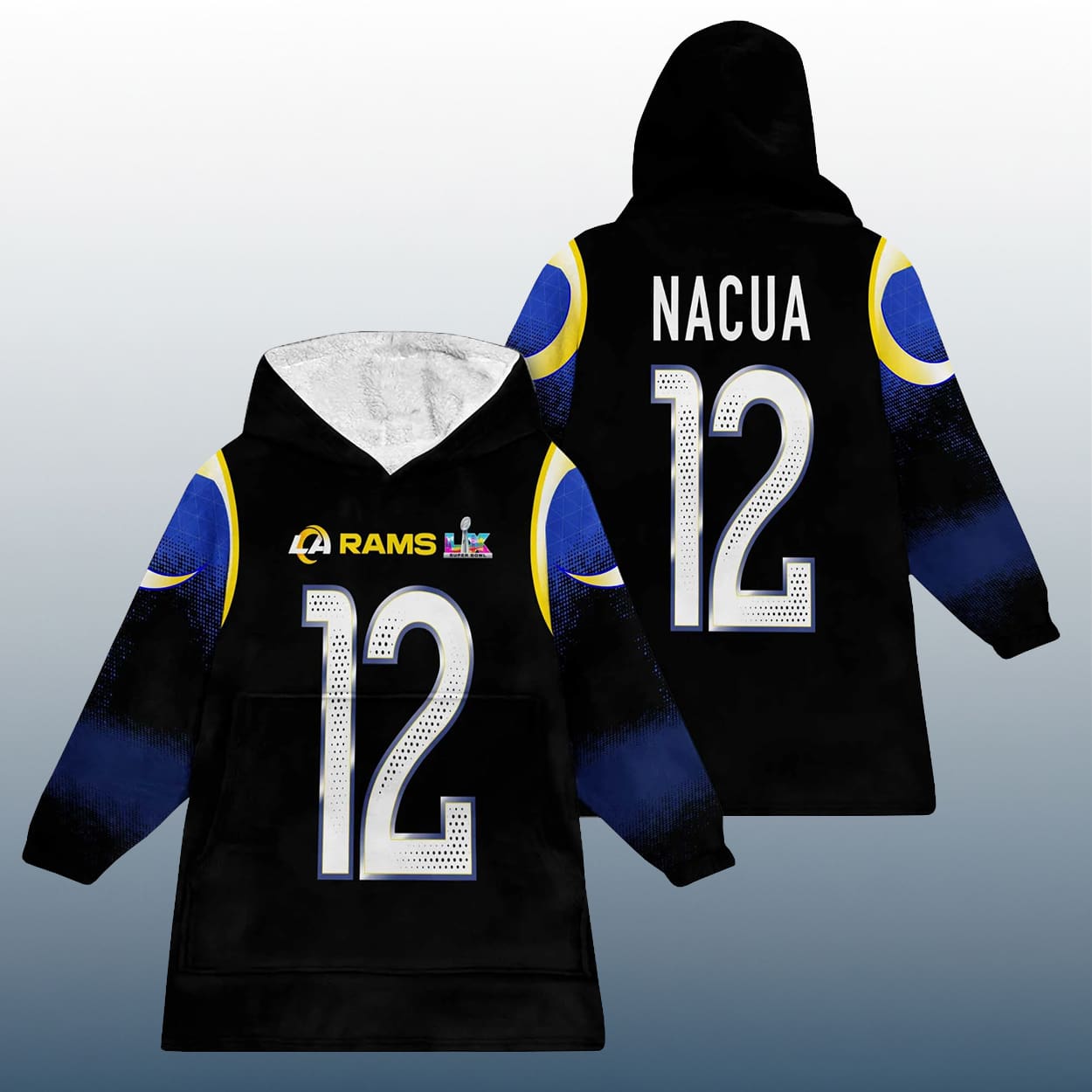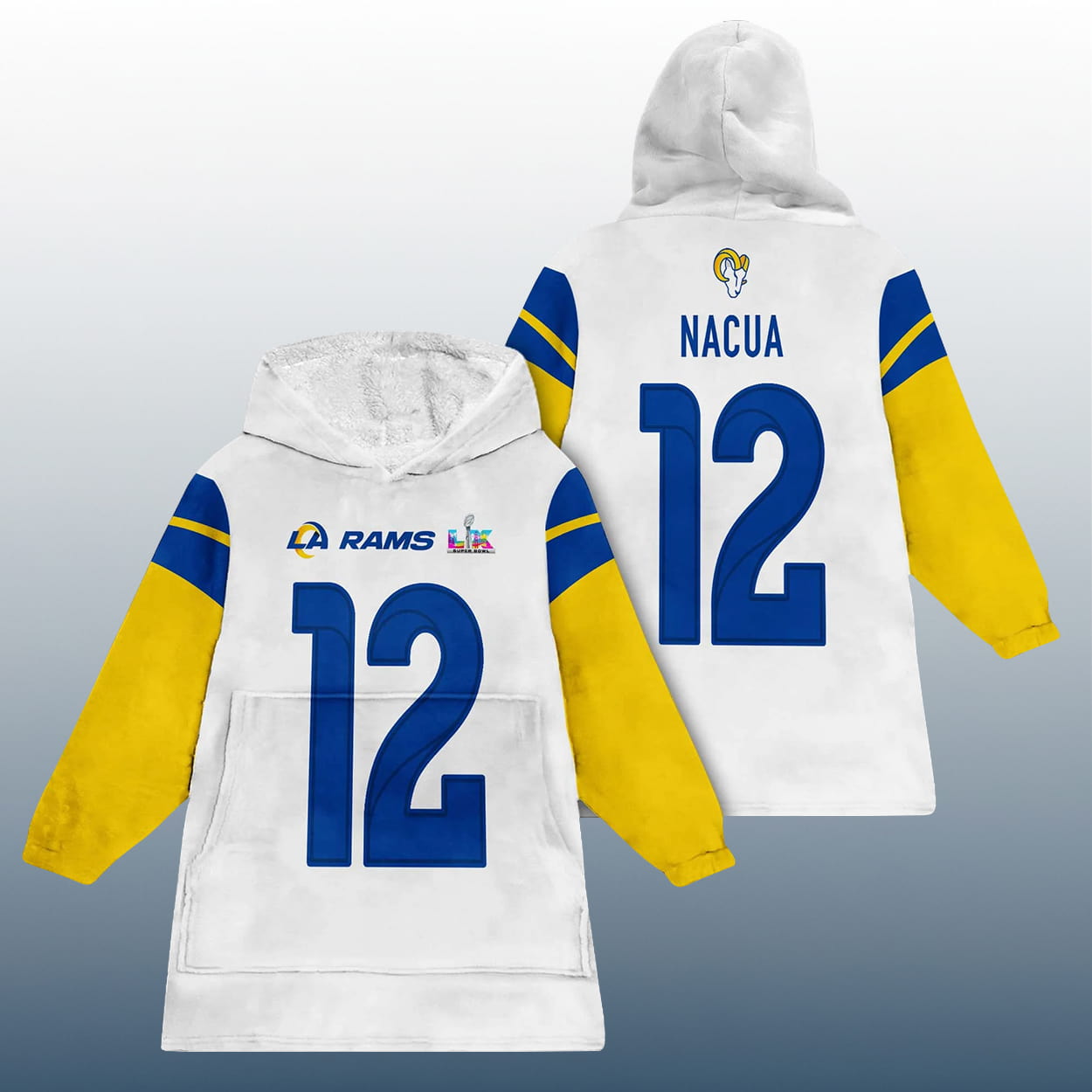 This hoodie is your ultimate sideline-to-sofa statement piece. Styled like a Rams jersey, this hoodie bursts with team energy in bold blue and yellow. The front features the number “12” in crisp white and gold, flanked by the Rams logo and the word “RAMS” in bright yellow. A sleek SB LX emblem adds a championship touch. On the back, “NACUA” sits proudly above the number “12,” celebrating one of LA’s rising stars. Yellow shoulder stripes and sleeve details complete the look, giving you full-field flair with every wear.