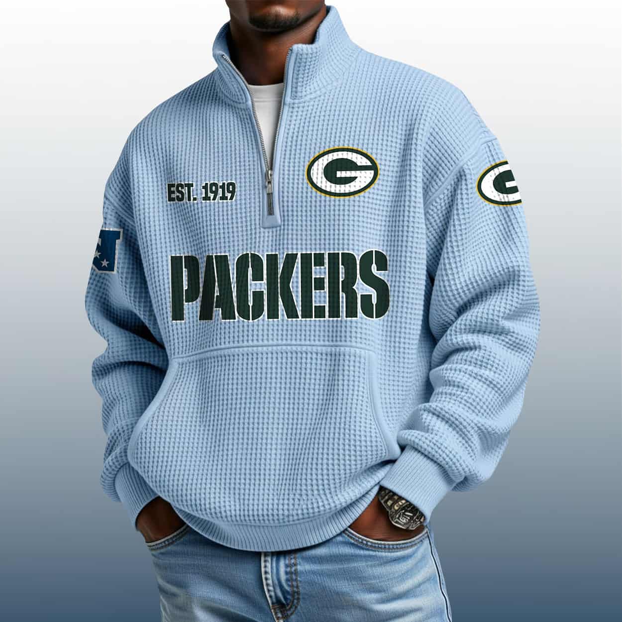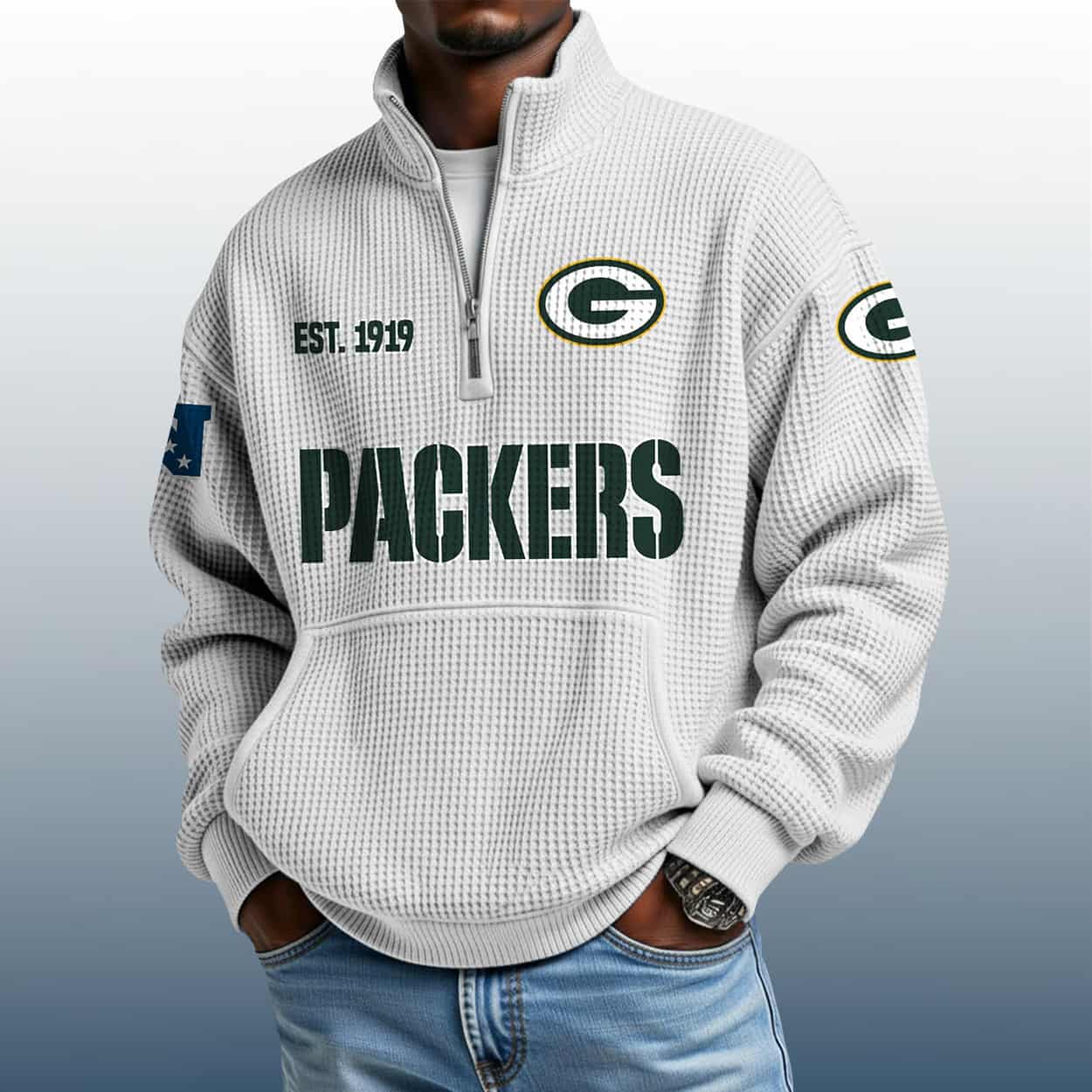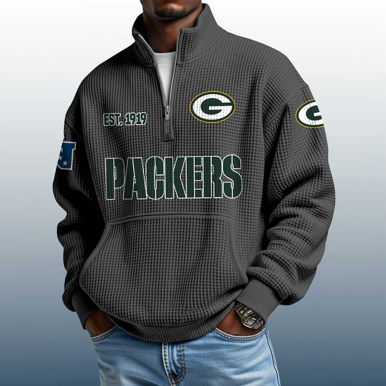 Show off your Packers pride with the Packers Est 1919 Stand Collar Half Zip Waffle Sweatshirt—where classic football heritage meets bold fan fashion.