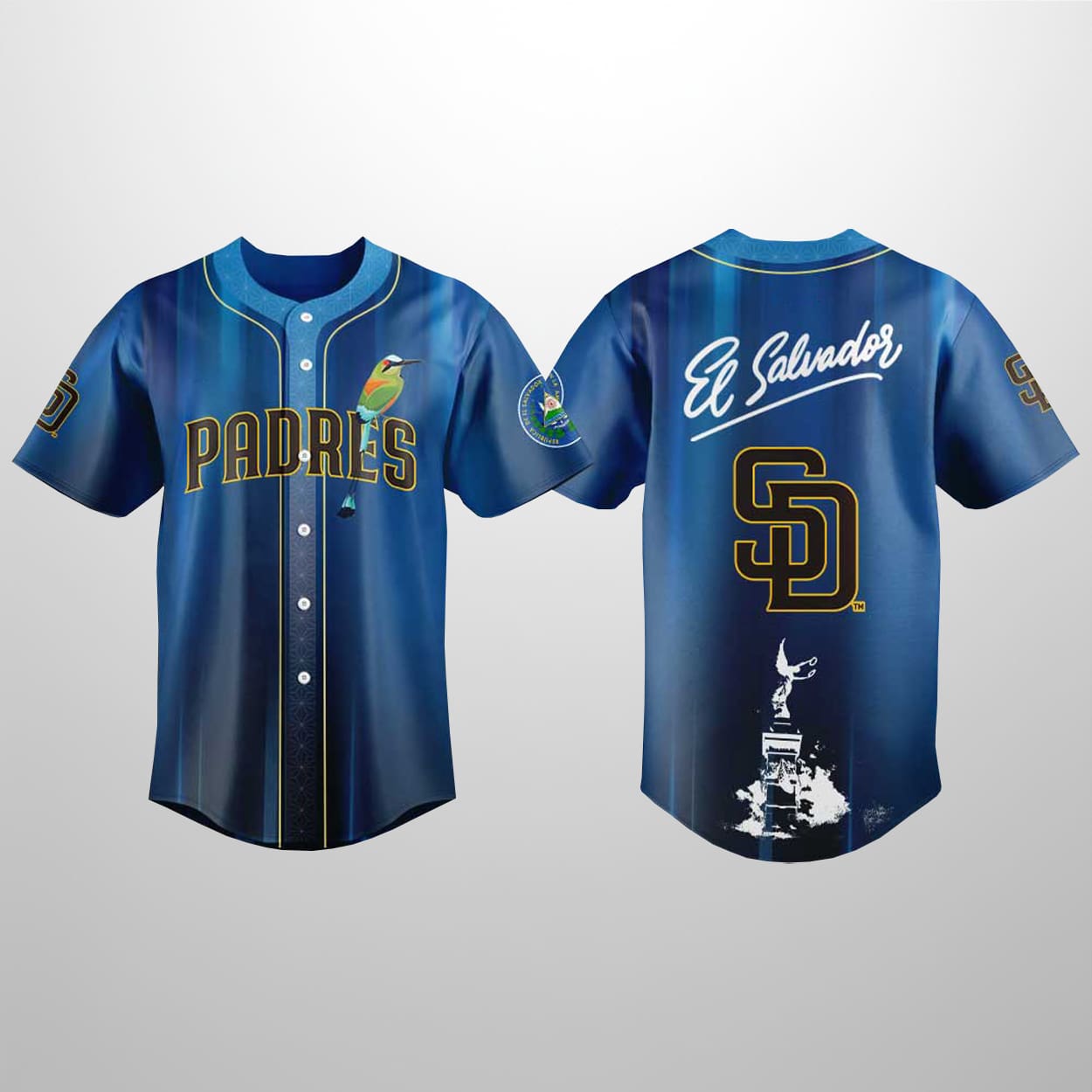 The inspiration behind this design celebrates the “bold thinker”—the fan who recognizes that baseball is a universal language that connects different worlds. This statement piece features an elegant white “El Salvador” script flowing across the back, positioned perfectly above the interlocking “SD” logo. Grounding the entire look is a white silhouette of the Monumento al Divino Salvador del Mundo at the base, bridging San Diego’s rich community spirit with the historical heart of El Salvador.