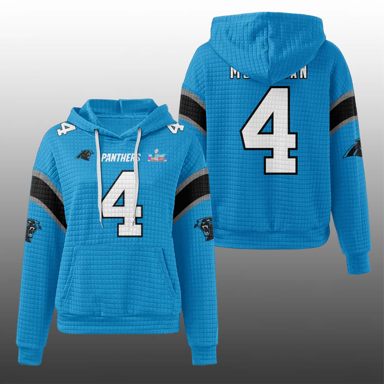 Step into the spotlight with this hoodie, a fan-favorite fusion of jersey flair and street-ready cool. This hoodie features McMillan’s number 4 front and center, with “PANTHERS” roaring above it like a battle cry. On the back, the number 4 returns with equal force, crowned again by “PANTHERS” in bold print. Blue and white stripes race down the sleeves, flanked by the fierce Panthers logo on each arm. And just to seal the deal? A crisp SB LX emblem sits proudly on the chest—because greatness deserves a spotlight.