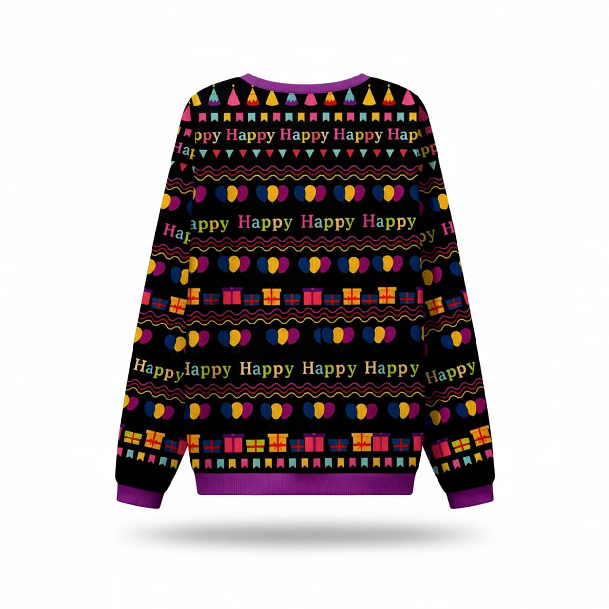 This isn’t your average ugly Christmas sweater—it’s a full-blown celebration in wearable form. Against a bold black backdrop, vibrant geometric shapes in pink, orange, yellow, and purple pop with joyful energy. The cuffs and neckline add a splash of purple flair, while the front steals the show with a cartoon-style graphic of one person carrying another, surrounded by rows of the word “Happy” in rainbow colors. Above and below the graphic, the bold white text reads “PARTY SAVIOR”—because let’s face it, every gathering needs one.