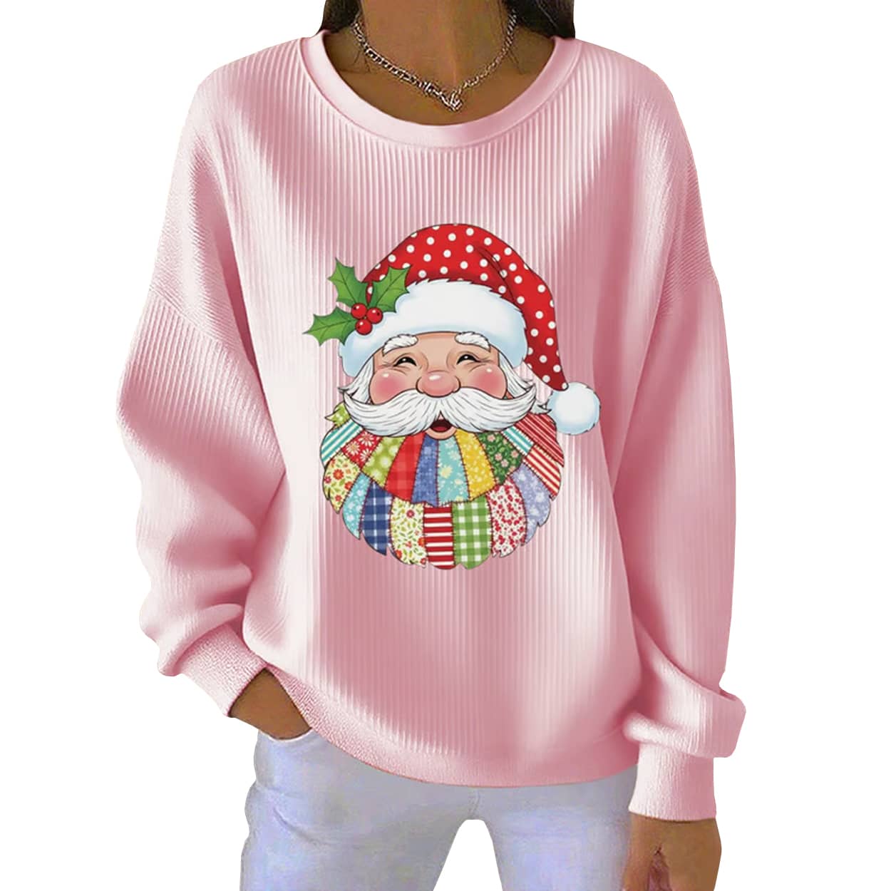 This sweatshirt is a merry mashup of holiday cheer and quirky charm. Front and center is a jolly Santa Claus face, complete with a red and white polka-dotted hat, holly accents, and a beard that’s anything but ordinary. His beard is a patchwork masterpiece, featuring stripes, checks, and polka dots in a rainbow of festive patterns. The light pink ribbed base adds a soft, cheerful touch, while the overall design makes this piece pop with personality. Whether you’re decking the halls or sipping cider by the fire, this sweatshirt brings the fun to any holiday gathering.