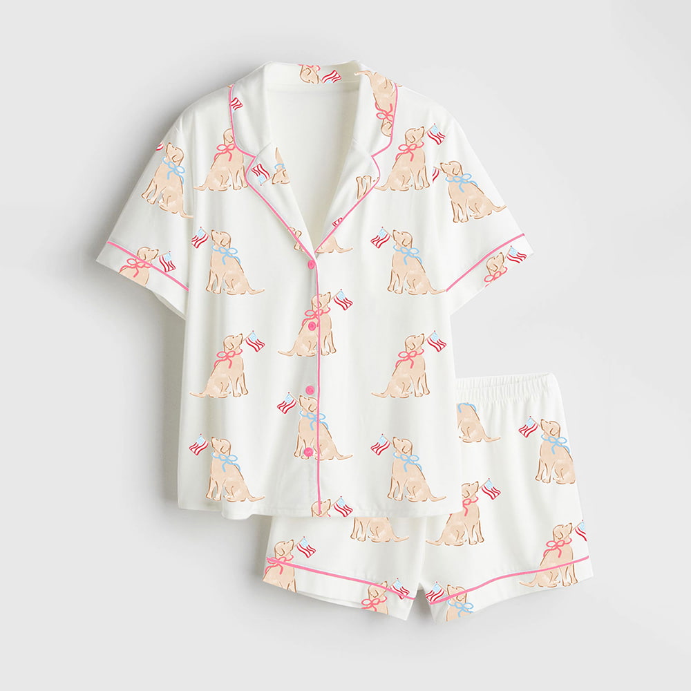 Get ready to celebrate Independence Day in cozy, stylish comfort with the Patriotic Pups 4th Of July Satin Pajama Set! This charming two-piece set includes a short-sleeved, button-up top and matching shorts, both crafted from smooth, breathable satin that feels against the skin. The standout feature is the delightful all-over print of playful pups, each proudly holding a tiny American flag, rendered in soft beige tones with pops of pink and red accents. The notched lapel collar and piping details add a touch of elegance, while the relaxed fit ensures all-night comfort. Ideal for summer nights or festive sleepovers, this pajama set combines patriotism with a whimsical canine twist, making it a must-have for dog lovers and holiday enthusiasts alike.