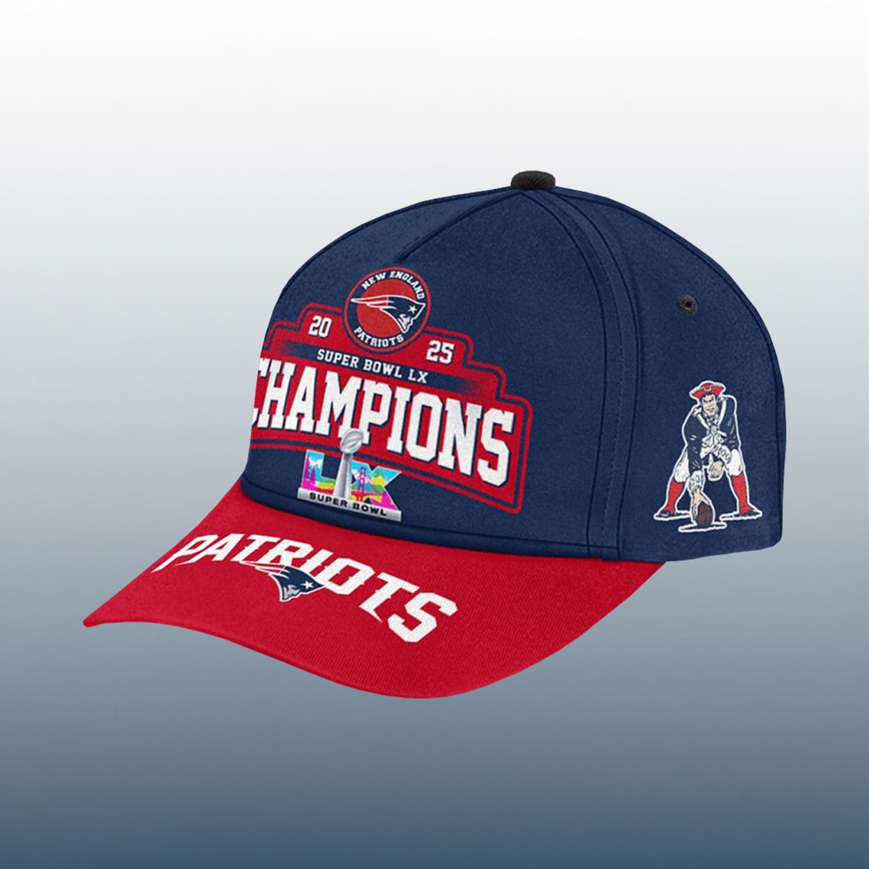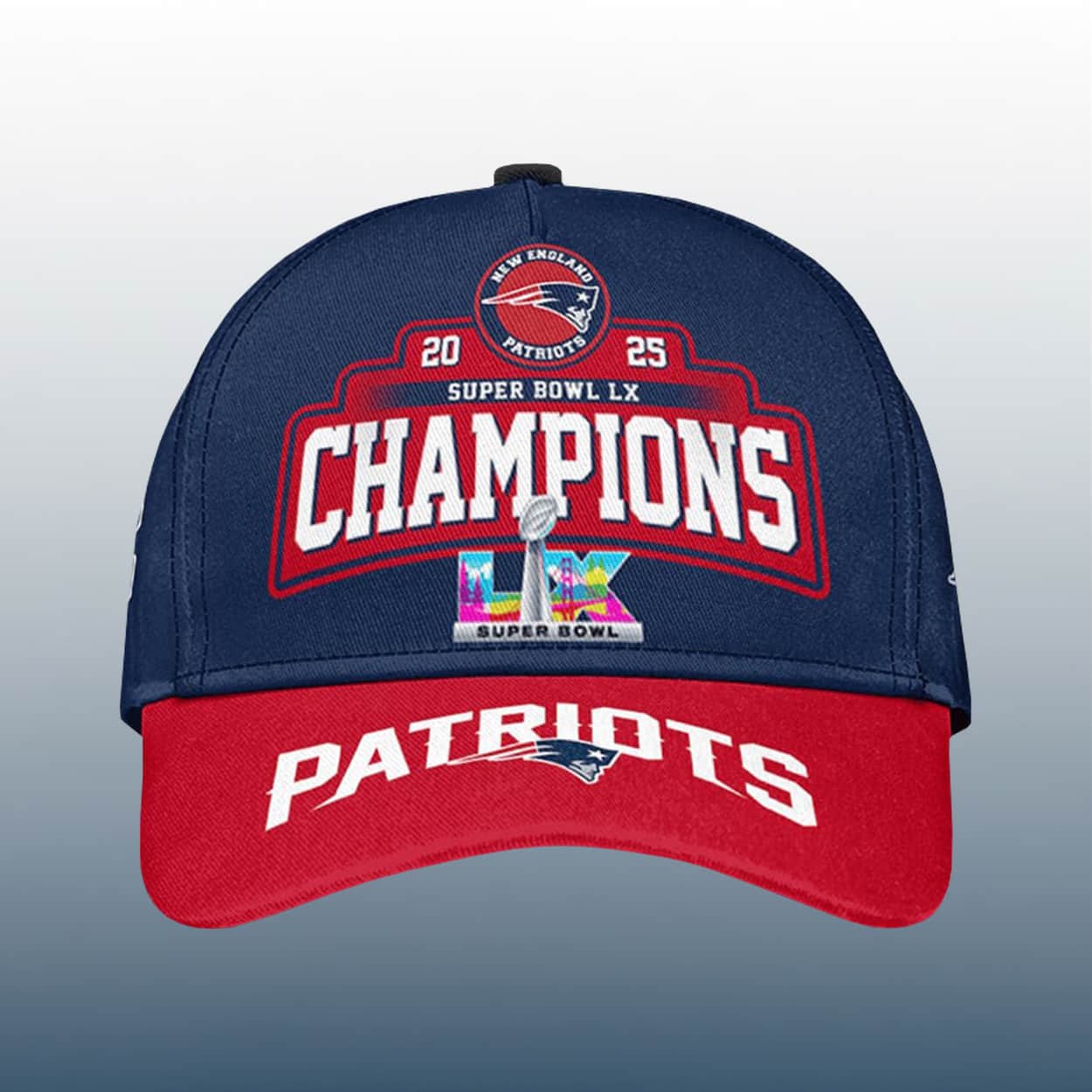 Victory never looked so good. This cap is a head-turning tribute to one of the most thrilling seasons in history. With a navy crown and a fiery red brim, this cap screams championship pride. The front panel boasts “CHAMPIONS” in bold white letters outlined in red, flanked by “SB LX”—just in case anyone forgot who ruled the gridiron. The Patriots logo sits proudly atop the text, while the SB LX emblem anchors the design below. Flip to the brim and you’ll find “PATRIOTS” spelled out in bold white, backed by the team’s iconic logo. It’s not just a cap—it’s a celebration.