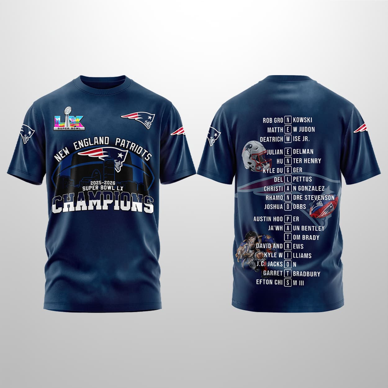 This shirt is a fan’s dream stitched into reality. The front proudly showcases “PATRIOTS” and “CHAMPIONS” in bold lettering, flanked by the SB LX logo and the team’s emblem. Flip it over and you’re greeted by a roll call of greatness—player names and numbers from the championship roster, alongside action shots of two standout stars mid-play. It’s a visual victory parade, all on your back.