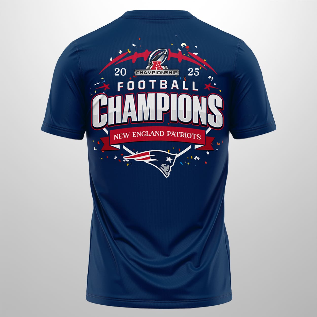 Get ready to relive the glory with this shirt—a fan essential that turns heads and sparks chants. The front boasts a bold “CHAMPIONS” headline in crisp white, paired with a fierce Patriots helmet graphic. Just above, the red text “2025 AFC CHAMPIONSHIP CHAMPIONS”, anchored by a sleek Patriots logo at the base. Flip it around and the celebration continues: “2025 FOOTBALL CHAMPIONS” explodes across the back, surrounded by confetti, stars, and a larger-than-life Patriots emblem. It’s a full-throttle tribute to a season that made history.