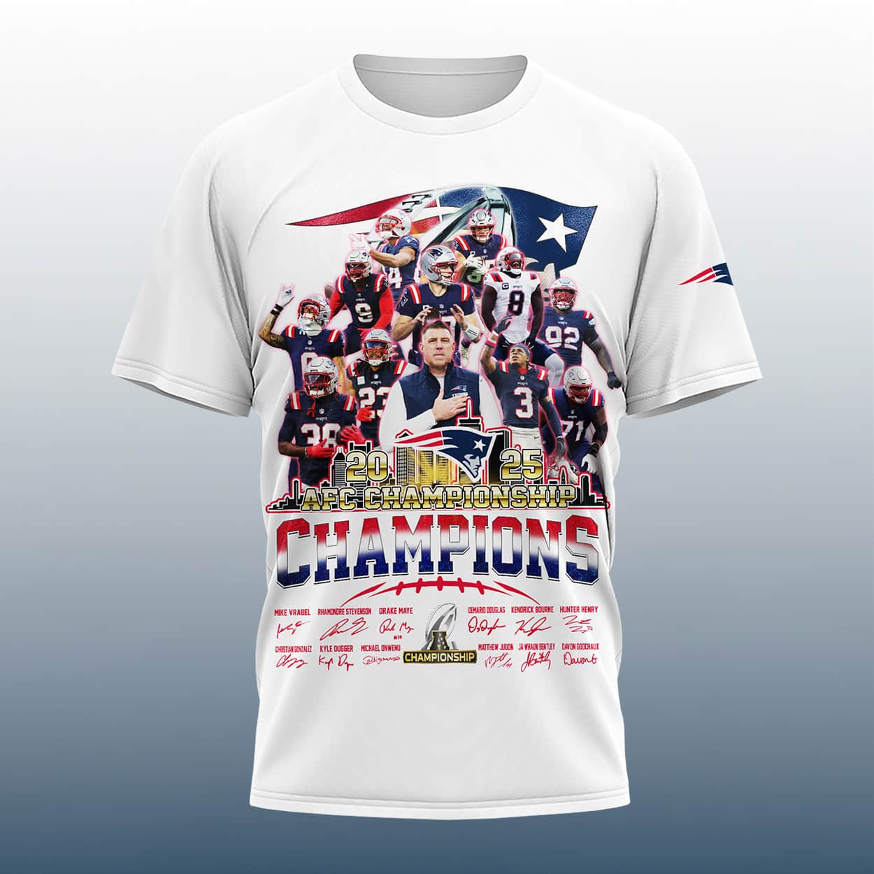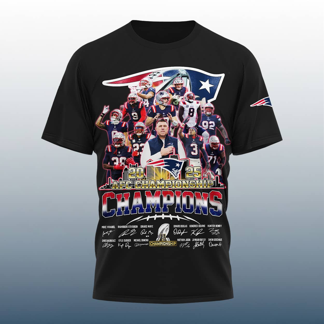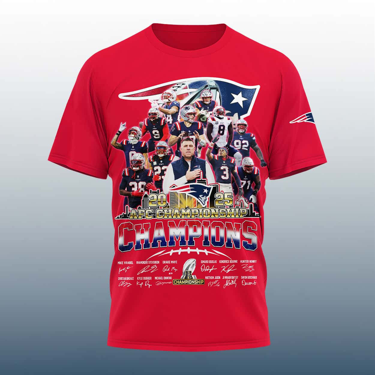 Relive the most electric season in recent Foxborough history with this shirt. This deep navy tribute captures the essence of a squad that turned a 4-13 slump into a 14-3 powerhouse performance. The design features a centered, resolute Mike Vrabel—the 2025 Coach of the Year—surrounded by the high-impact playmakers who led the charge. From the precise throws of Drake Maye to the defensive dominance of Christian Gonzalez, every hero of the AFC title run is immortalized in this vibrant, action-packed graphic.
