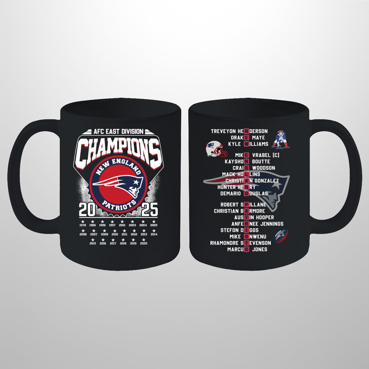 Raise your mug to triumph with the ultimate fan collectible. One side proudly boasts the bold proclamation: “AFC EAST DIVISION CHAMPIONS – NEW ENGLAND PATRIOTS – 2025,” framed by rows of miniature helmet icons that hint at the battles won and games conquered. Flip it around and you’ll find a roll call of gridiron greatness: names like Drake Maye, Stefon Diggs, and Mike Vrabel etched alongside team logos, immortalizing the roster that brought the title home. It’s not just a mug—it’s a moment frozen in time.