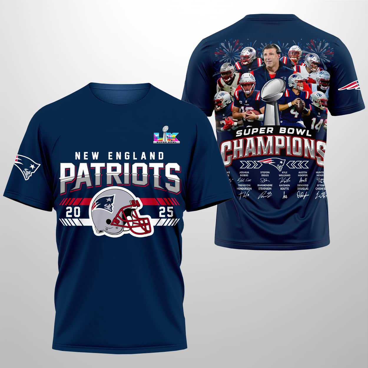 This commemorative shirt is more than just fan gear—it’s a wearable celebration of the Patriots’ epic victory over the Seahawks in SB LX. The front proudly displays “PATRIOTS” with the iconic team logo flanked by the year “2025,” while the back bursts with energy: a collage of players hoisting the Lombardi Trophy, surrounded by the text “SB CHAMPIONS.” To top it off, the shirt honors past victories with logos of earlier championships, making it a timeline of triumphs stitched into one bold design.