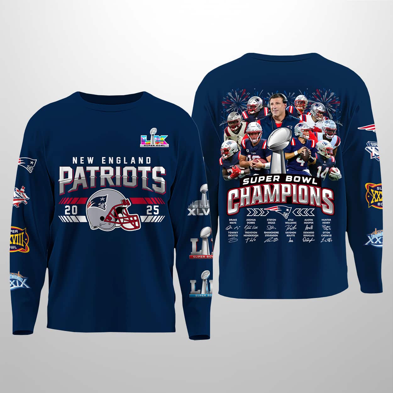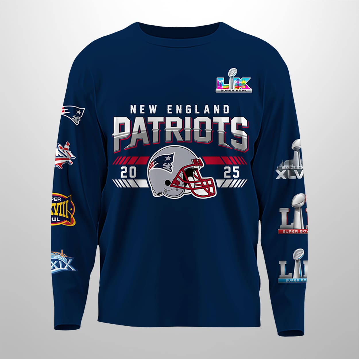 This navy blue long-sleeve sweatshirt is more than apparel—it’s a victory statement. The front proudly displays “PATRIOTS” alongside the team logo and the year 2025, marking their SB LX triumph. Both sleeves are decorated with iconic SB logos, a playful nod to the team’s rich championship legacy. Flip it around, and the back bursts into life with a collage of Patriots players, the Vince Lombardi Trophy, and the bold proclamation “SB CHAMPIONS.” Below, the scoreboard history of their victories is neatly listed, immortalizing every hard-fought win.