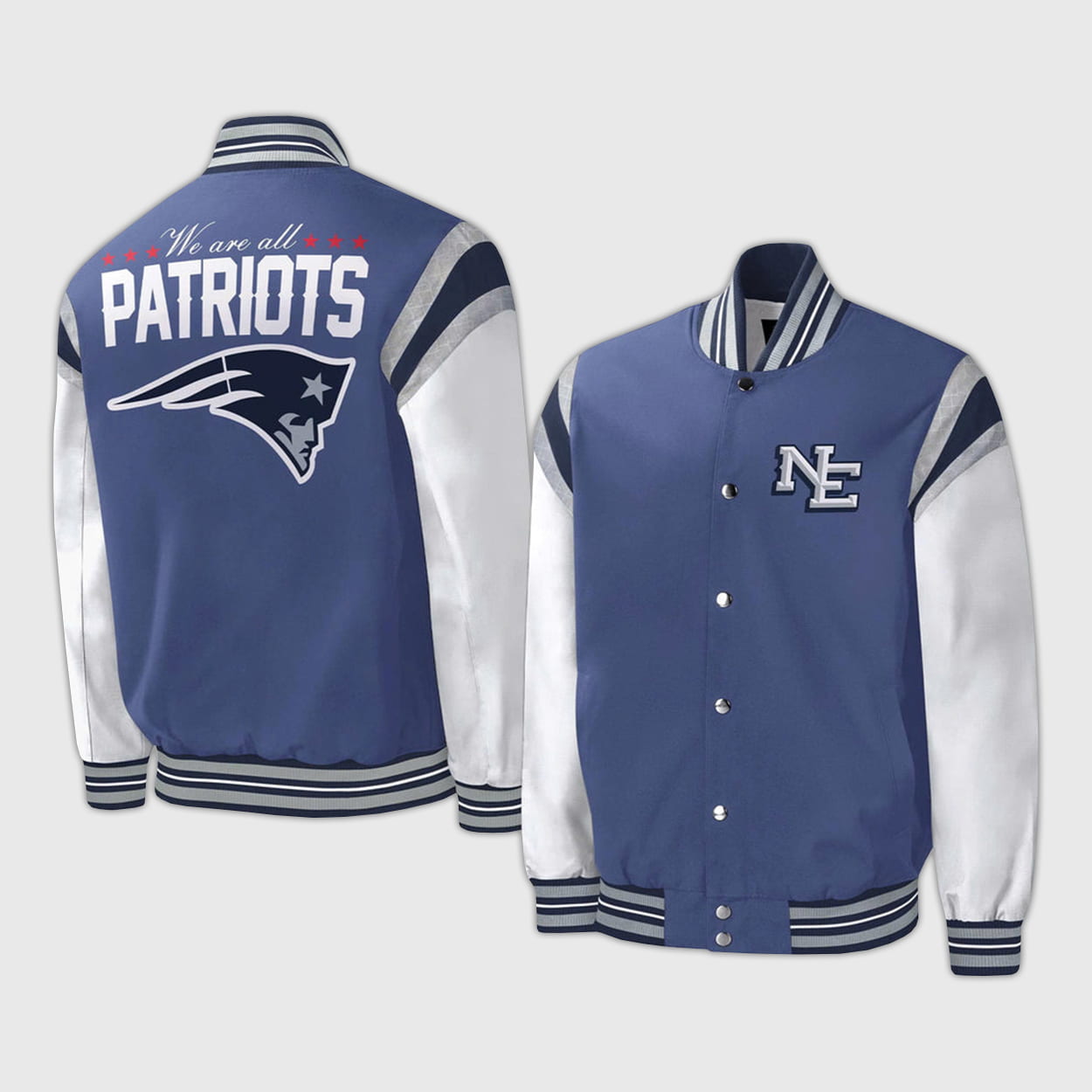 This varsity-style bomber jacket comes in a deep storm blue, accented with crisp white striping on the cuffs, collar, and waistband—like a touchdown dance in textile form. The front keeps it cool with a minimalist “NE” logo, while the back goes full end-zone celebration: “We are all PATRIOTS” in bold white letters, five red stars floating above like victory confetti, and the iconic Patriots logo anchoring the look. It’s equal parts cozy and cocky.