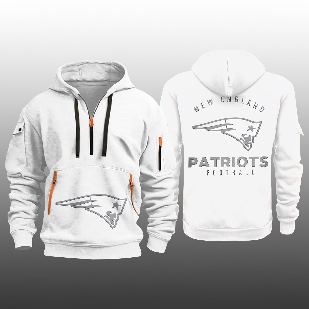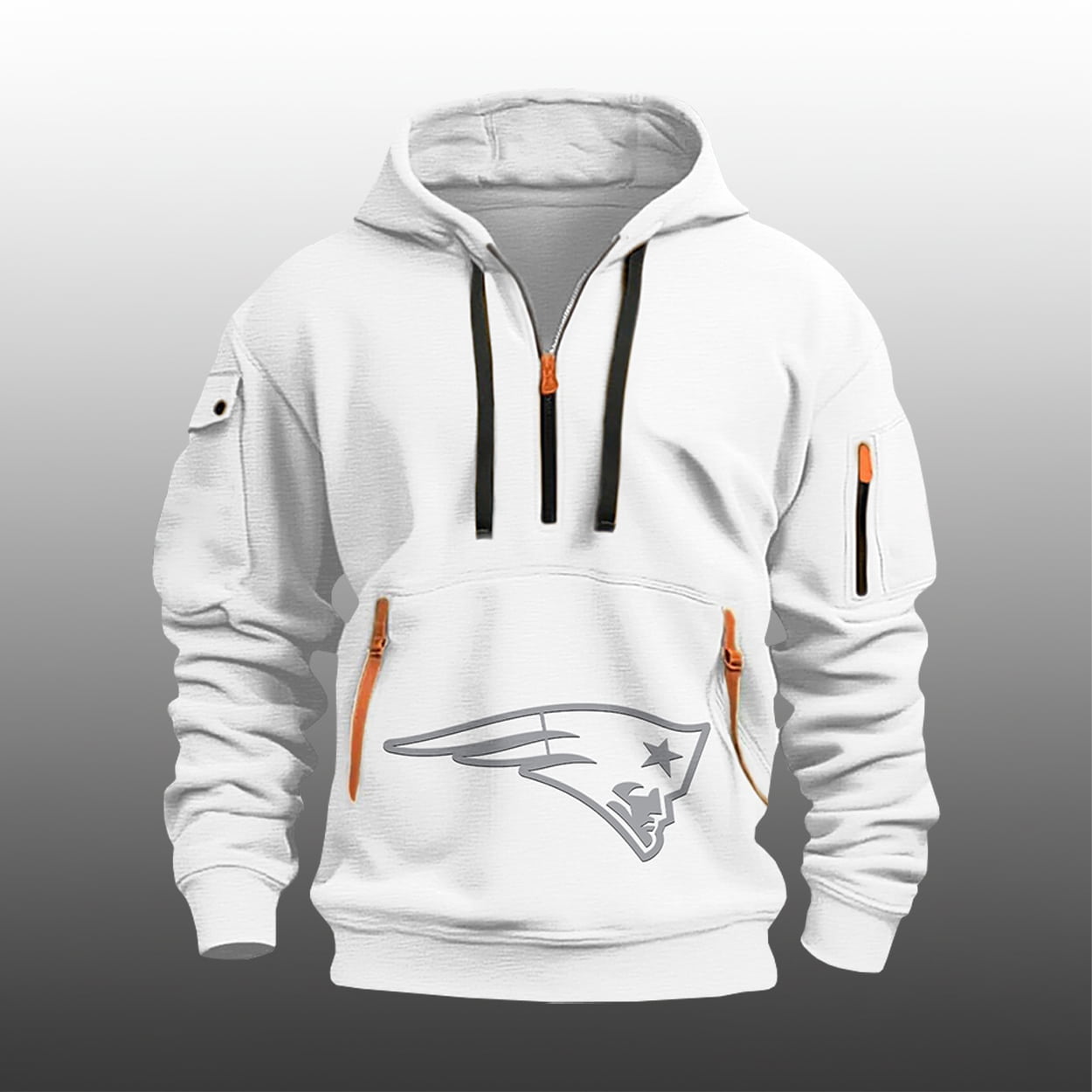 Step into the future of fan gear with this hoodie. This isn’t just another piece of team apparel; it’s a high-energy fusion of modern streetwear and classic New England grit. Bathed in a crisp, “white-out” aesthetic, this hoodie features a sleek quarter-zip neckline and a structured hood for maximum versatility. The standout design elements include tactical utility pockets on the sleeves and vibrant orange-tipped zippers that provide a sharp, high-visibility contrast against the snowy white backdrop.