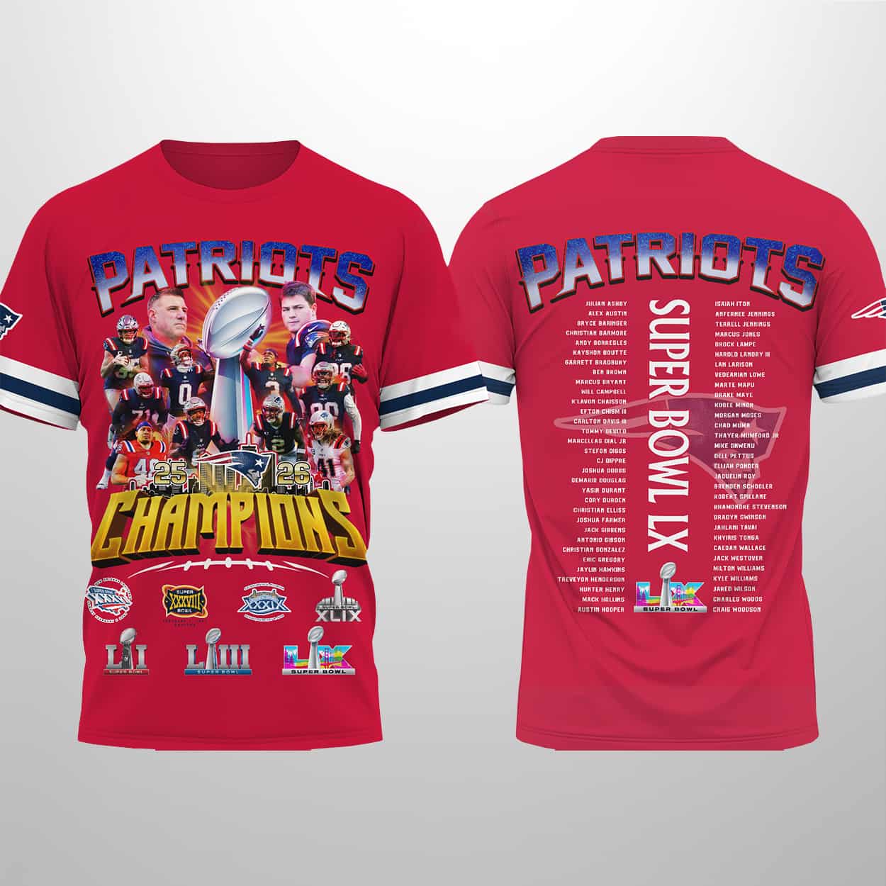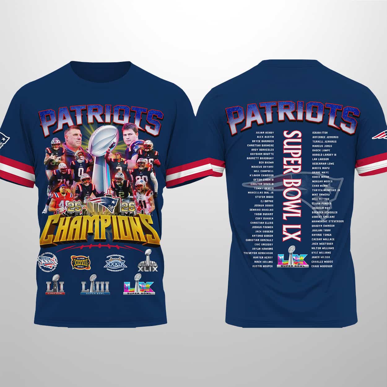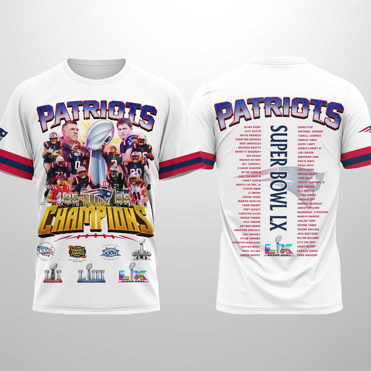 This shirt isn’t just apparel—it’s a declaration. The design draws inspiration from the Patriots’ relentless pursuit of greatness, blending nostalgia with modern flair. The sleeve logos and roster details make it more than a shirt; it’s a wearable story of resilience, teamwork, and glory. For fans who think boldly and live passionately, this piece is a badge of honor.